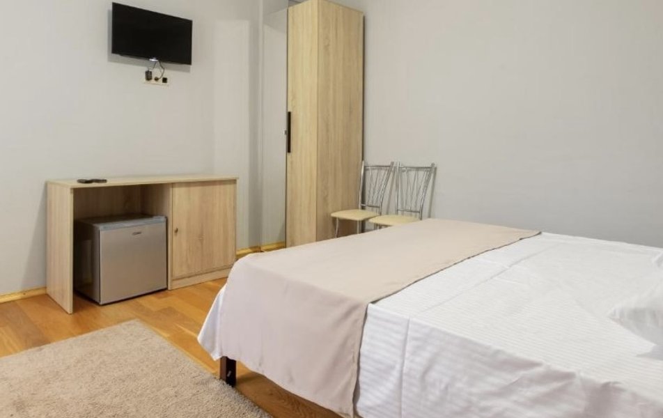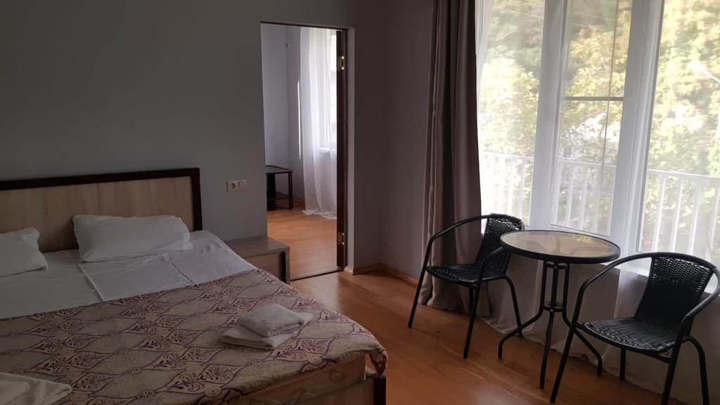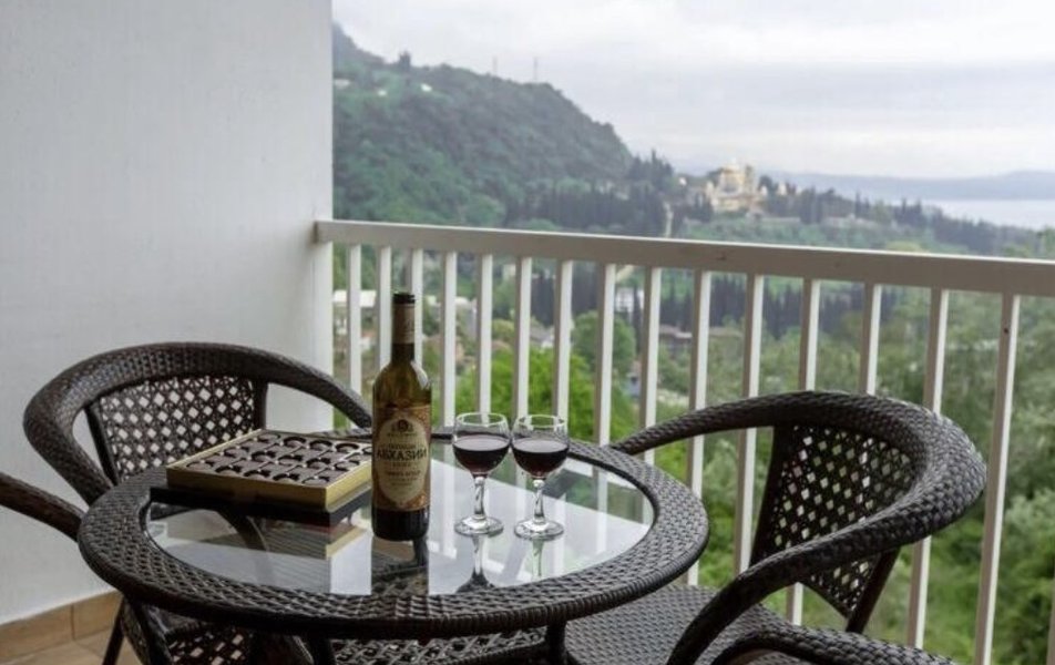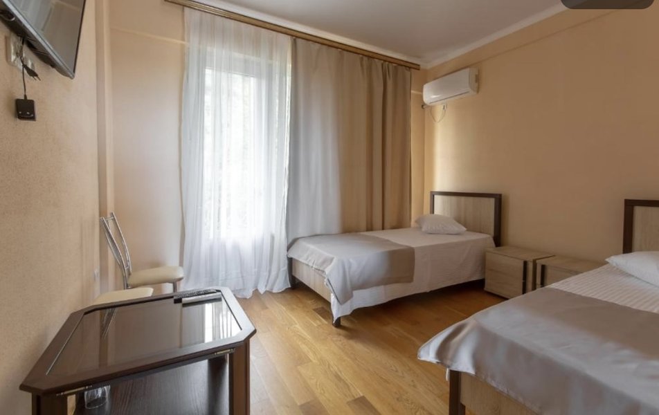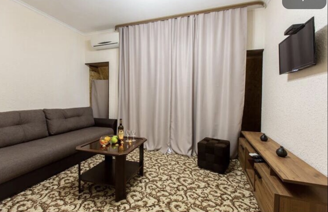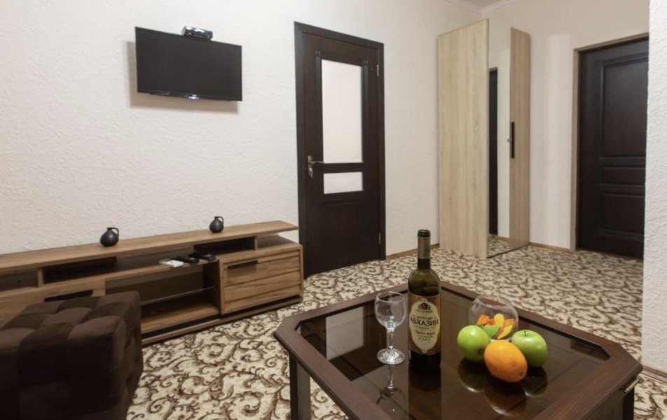 Просторный двухкомнатный номер с балконом и видом на окрестности. К услугам гостей двуспальная кровать, раскладной диван, журнальный столик, две тумбы, шкаф, кондиционер, телевизор, Wi-Fi, холодильник. В ванной комнате душ, фен, туалетно-косметические принадлежности.