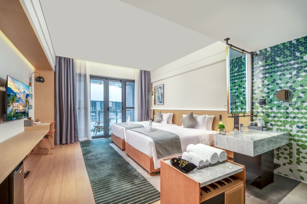 Комплектация номера включает двуспальную кровать king-size/2 односпальные кровати, кондиционер, телевизор, телефон, сейф. В числе прочих удобств Wi-Fi, набор для приготовления чая и кофе, фен, туалетно-косметические принадлежности, утюг, гладильная доска. Ванная комната с душем.