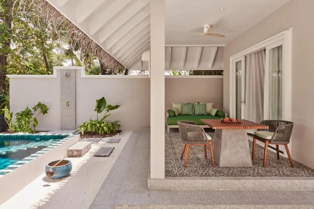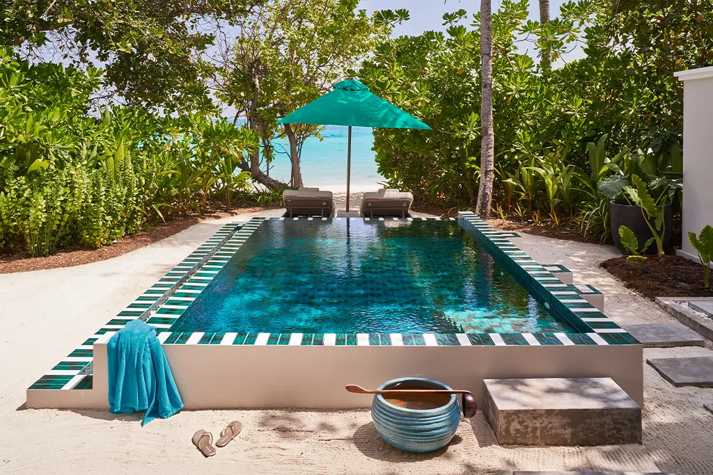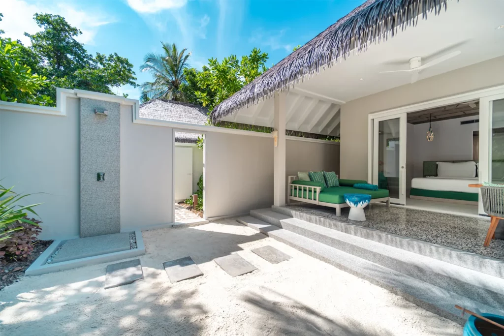 Вилла с отдельным выходом на пляж расположена в тропическом саду. В числе удобств — просторная открытая обеденная терраса с шезлонгами. Вилла оснащена двуспальной кроватью, мини-баром, винным баром, телевизором, кондиционером, сейфом, телефоном, акустической системой, феном. Имеется душ, ванна на открытом воздухе.