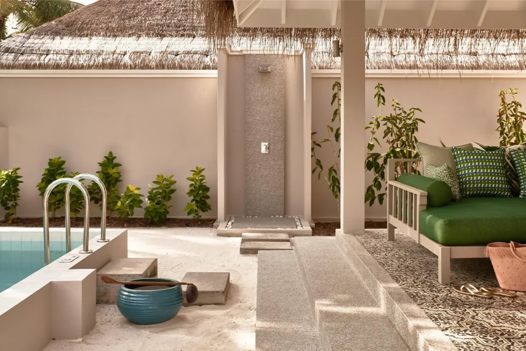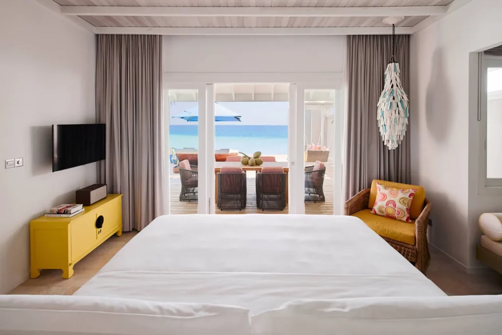 Вилла с прямым выходом к океану оборудована спальней с двуспальной кроватью, санузлом с ванной, душем в помещении и на улице, террасой с бассейном, зоной отдыха с диваном и креслами. Среди удобств кондиционер, телевизор, акустическая система, сейф, бесплатный Wi-Fi, мини-бар и винный бар, фен, туалетные принадлежности.