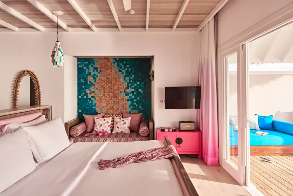 Вилла, расположенная над водой, имеет террасу с зоной отдыха и прямым спуском в воду, спальню с двуспальной кроватью, ванную комнату с ванной, двойной раковиной и тропическим душем на открытом воздухе. В комплектацию входит кондиционер, телевизор, телефон, сейф, мини-бар и винный бар, бесплатный Wi-Fi, фен, косметические средства.