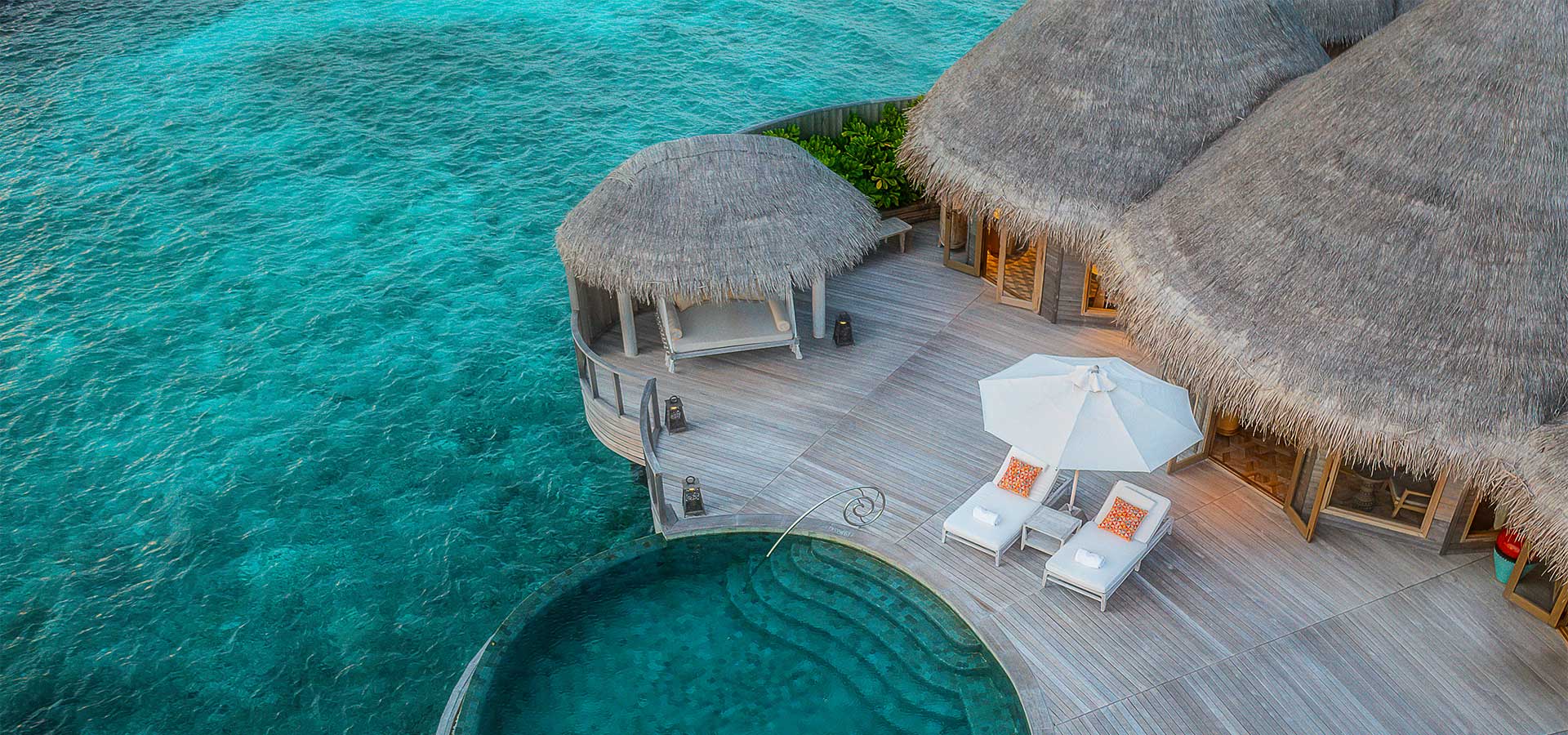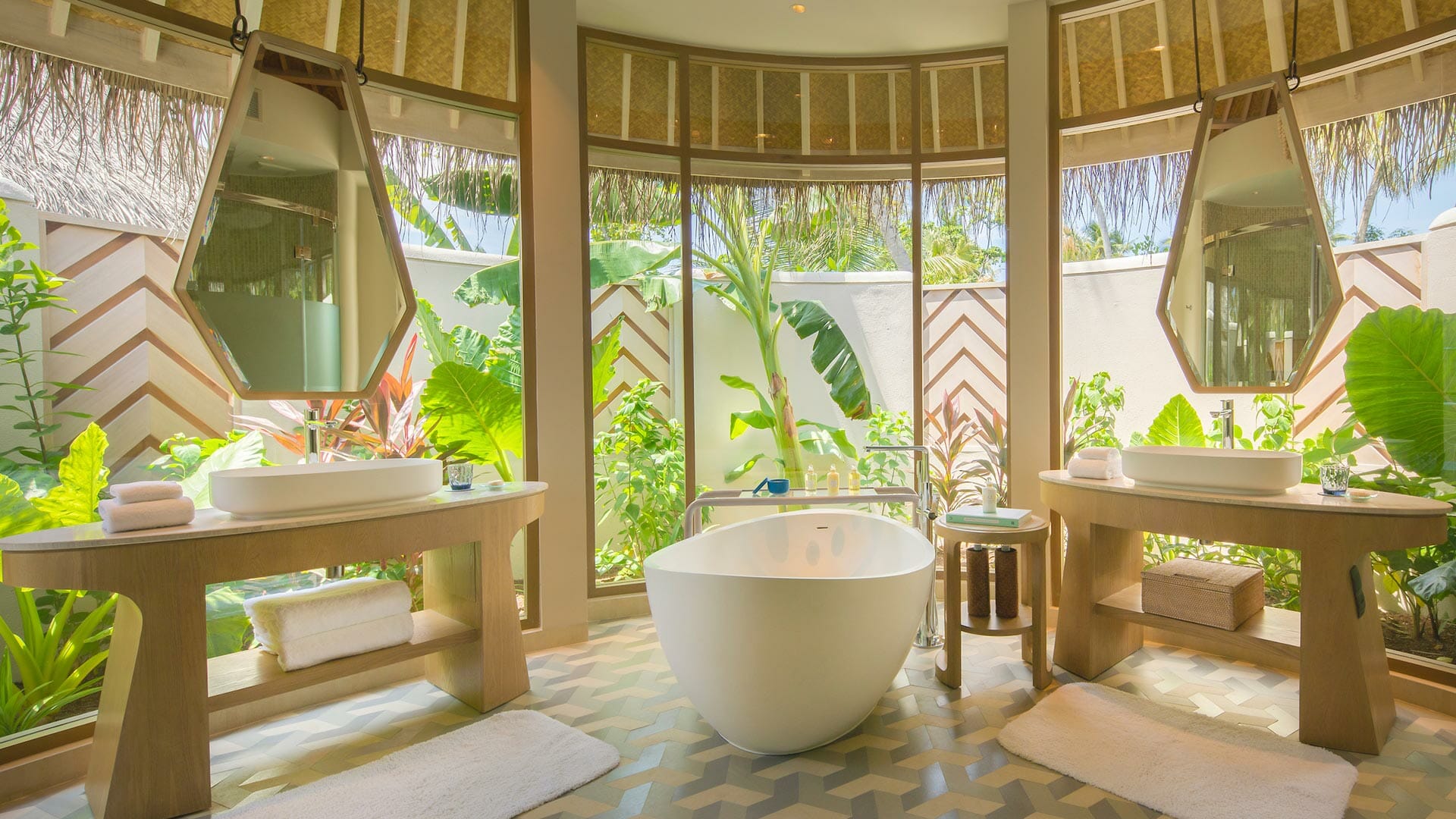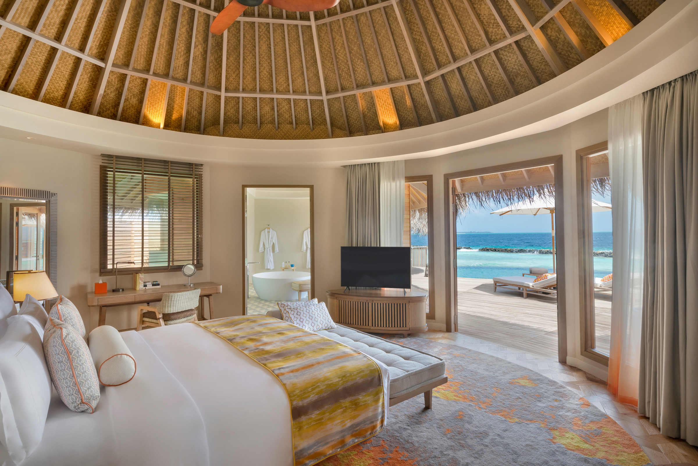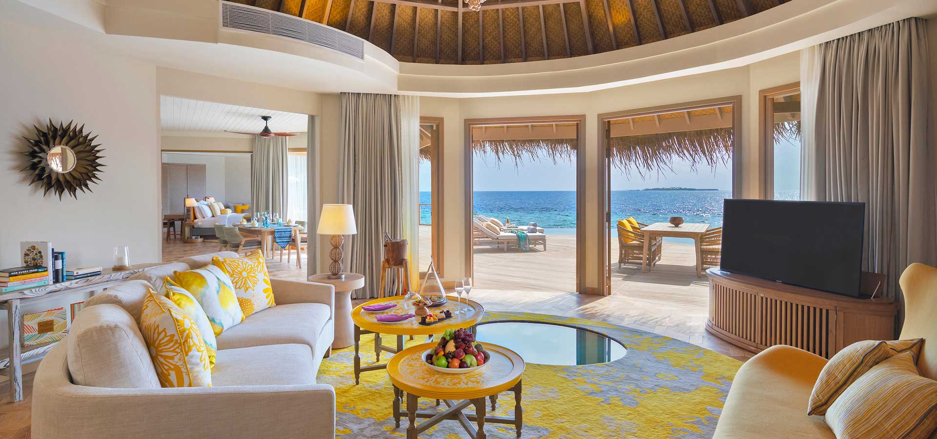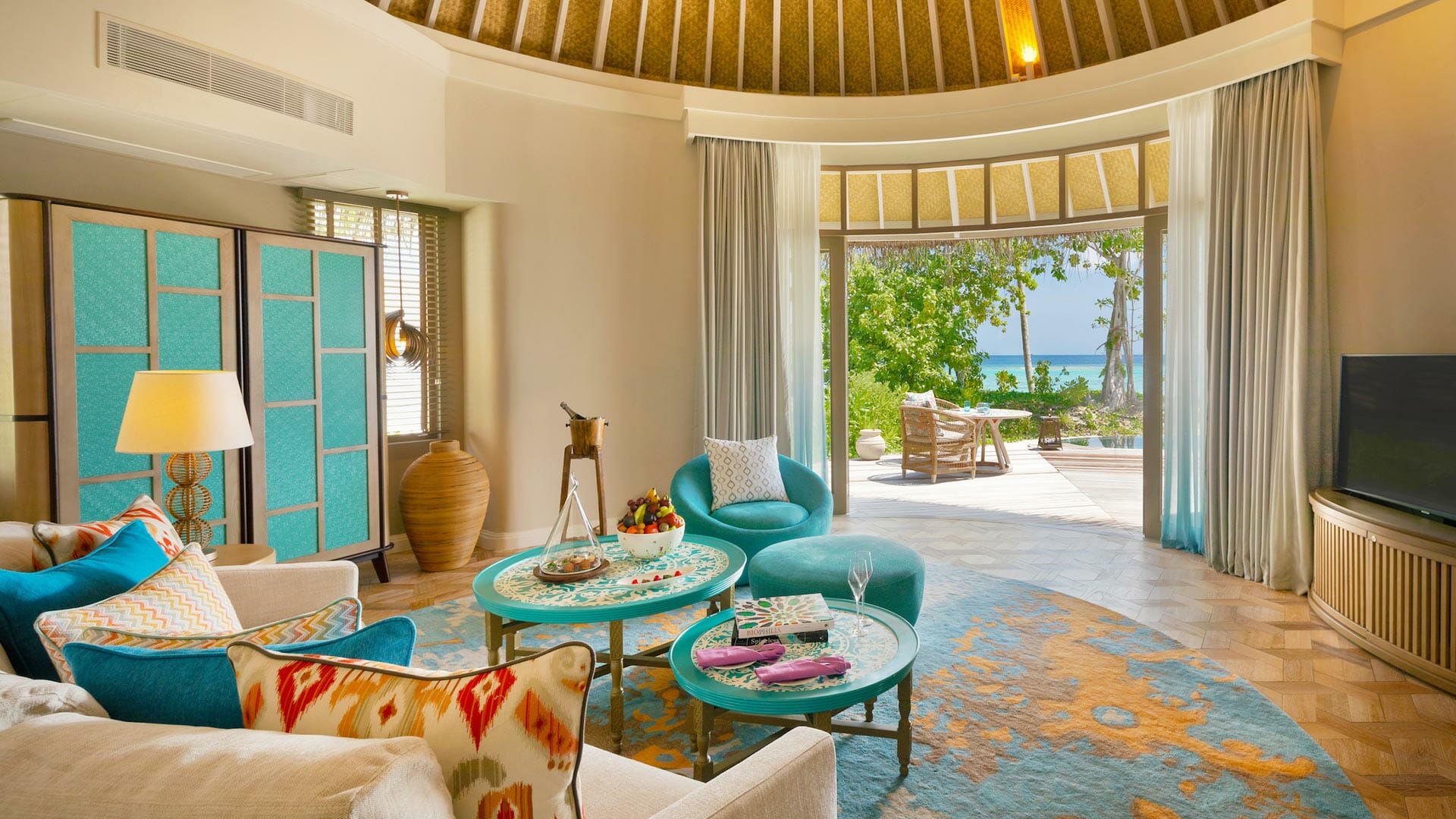 Двухкомнатный домик состоит из спальни, гостиной, ванной комнаты с ванной и душем, террасы с бассейном и спуском в лагуну. В числе удобств кондиционер, кофемашина и принадлежности для приготовления чая/кофе, телевизор, мини-бар и винный холодильник, Wi-Fi, улуги дворецкого и бесплатные фрукты ежедневно.