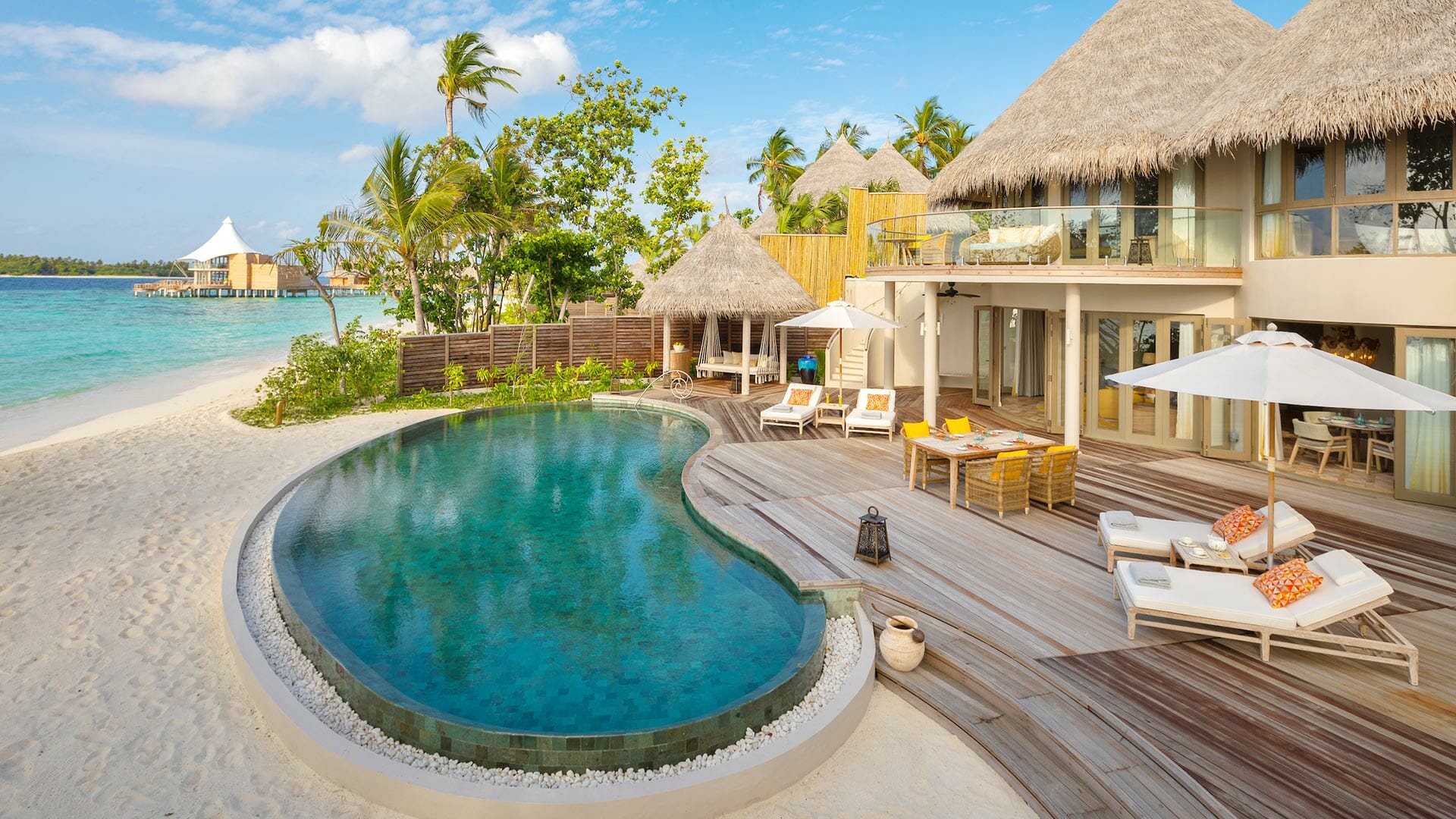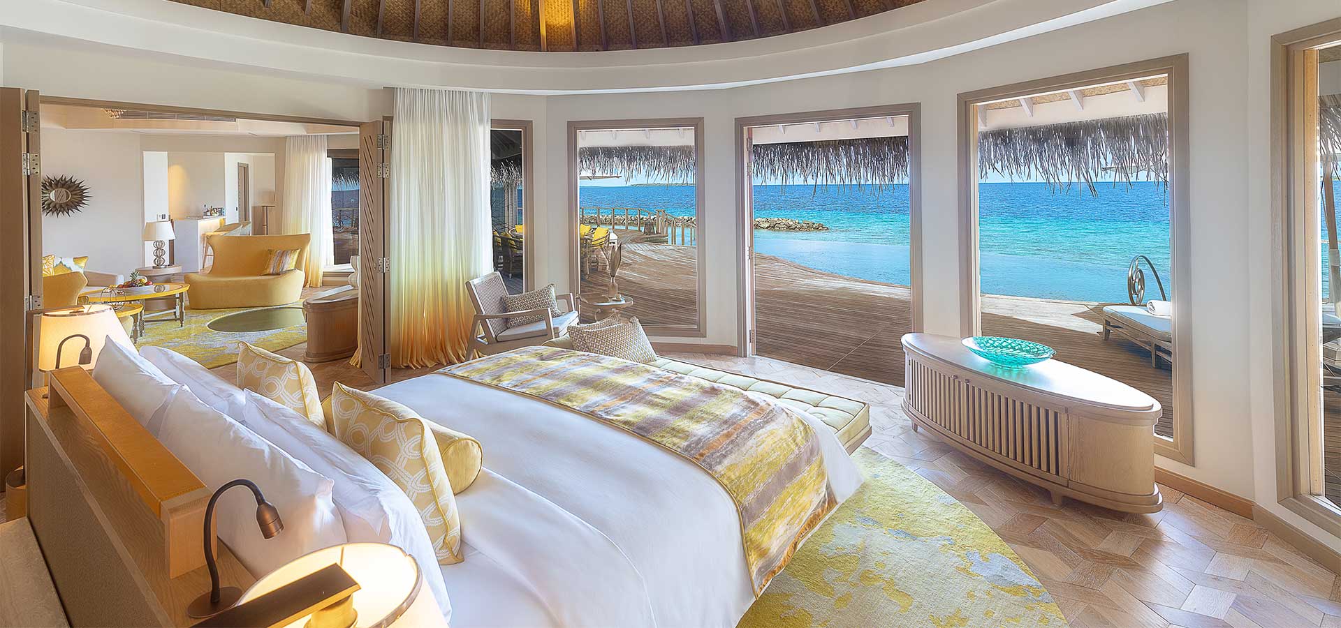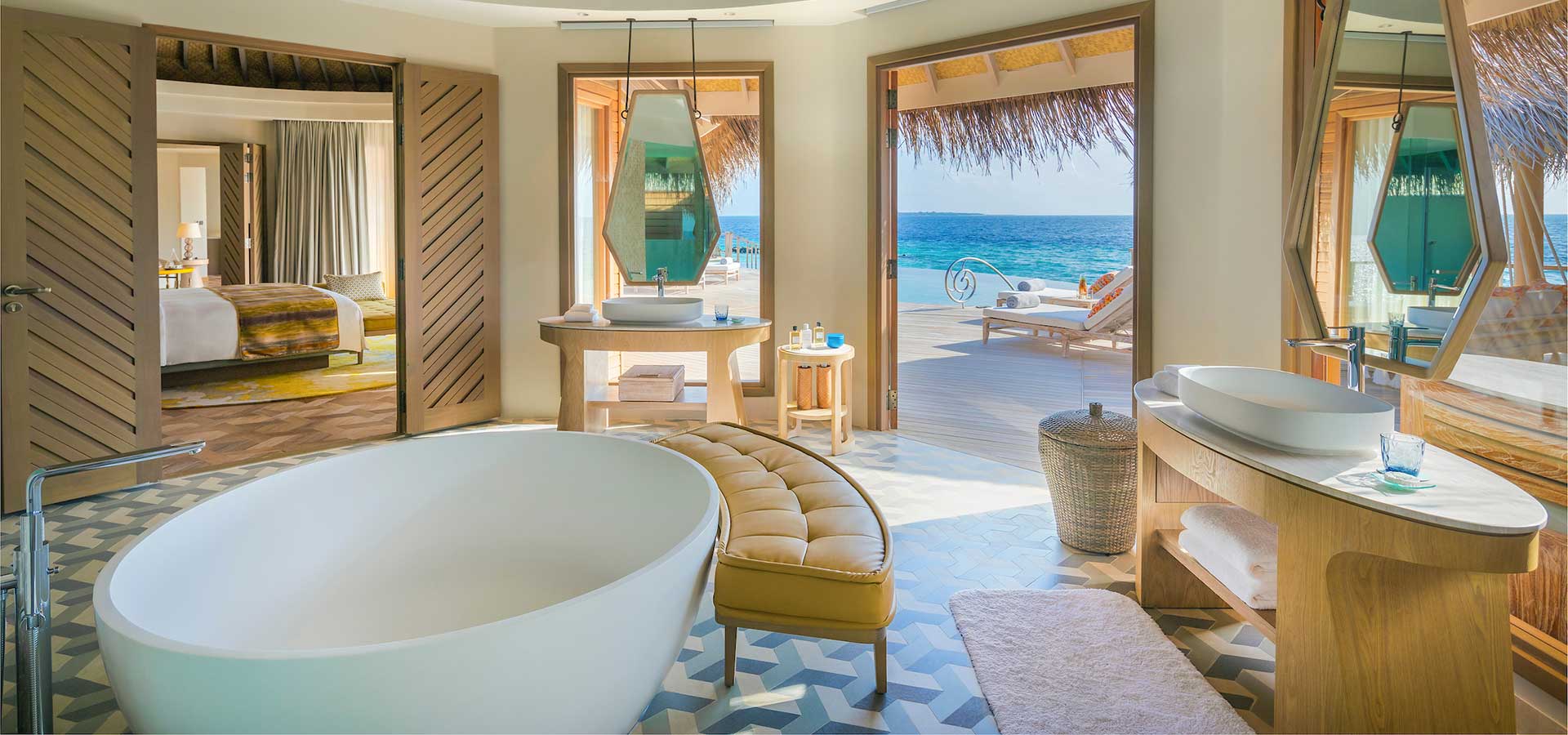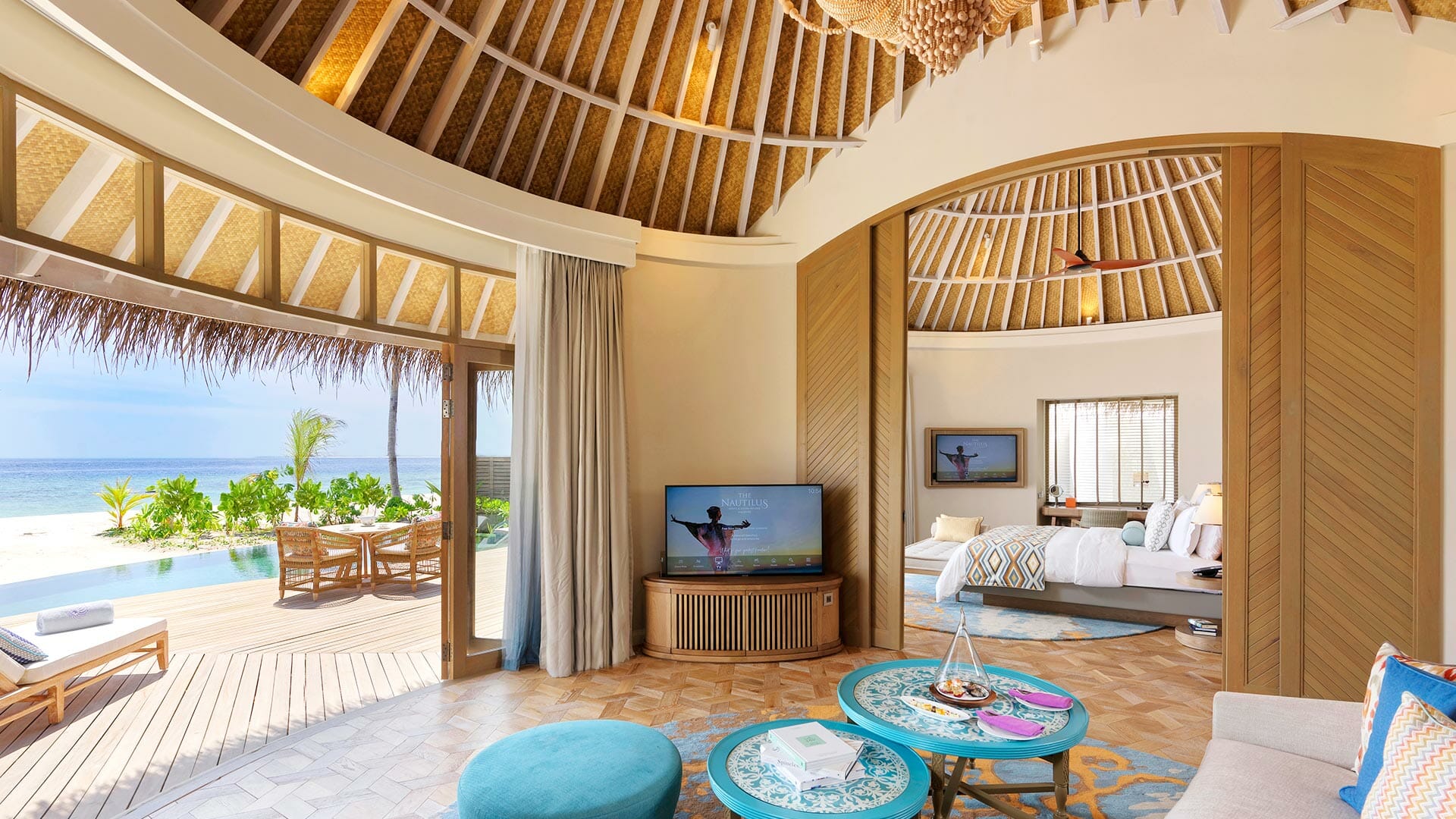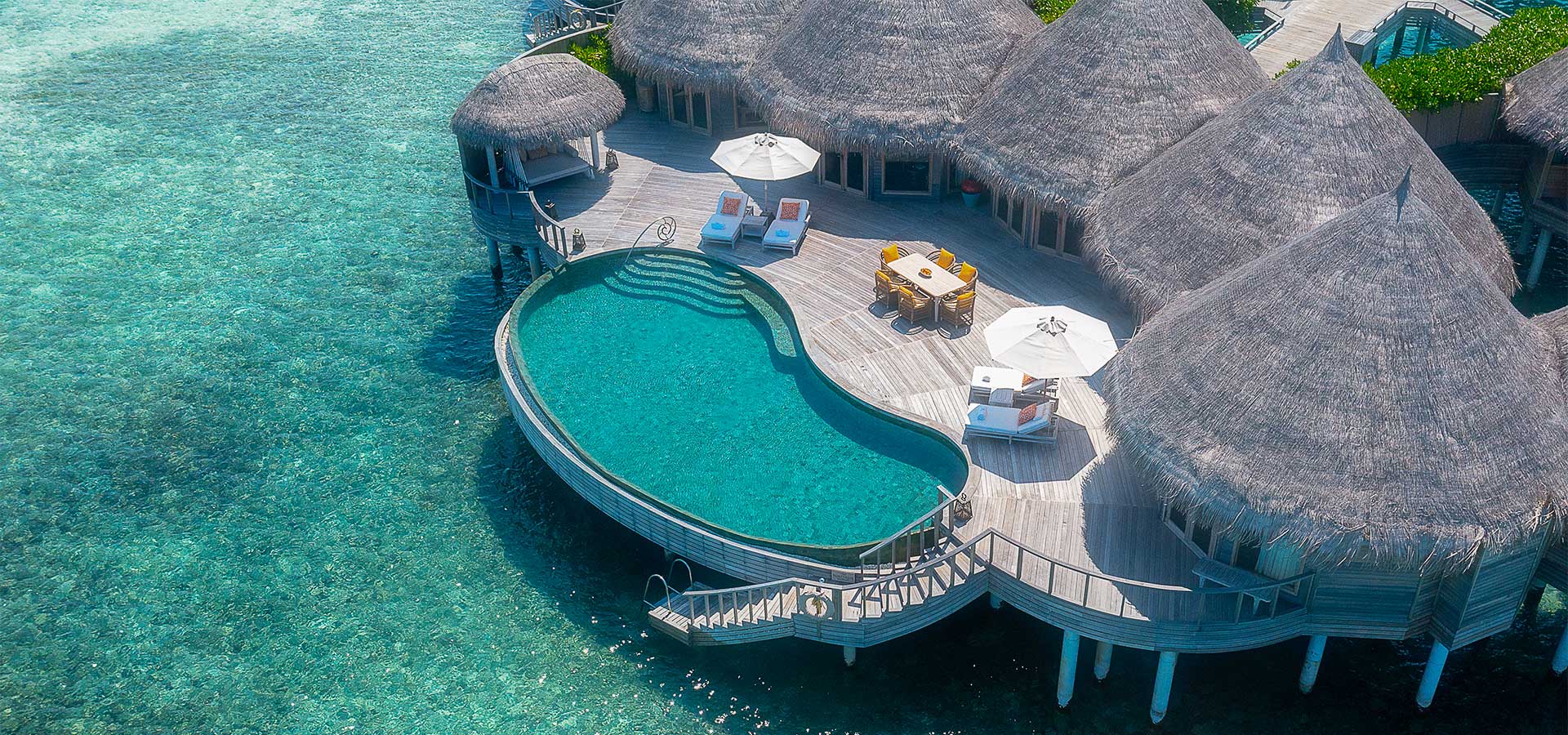 Двухкомнатный домик состоит из спальни, гостиной, ванной комнаты с ванной и душем, террасы с бассейном и спуском в лагуну. В числе удобств кондиционер, кофемашина и принадлежности для приготовления чая/кофе, телевизор, мини-бар и винный холодильник, Wi-Fi, улуги дворецкого и бесплатные фрукты ежедневно.