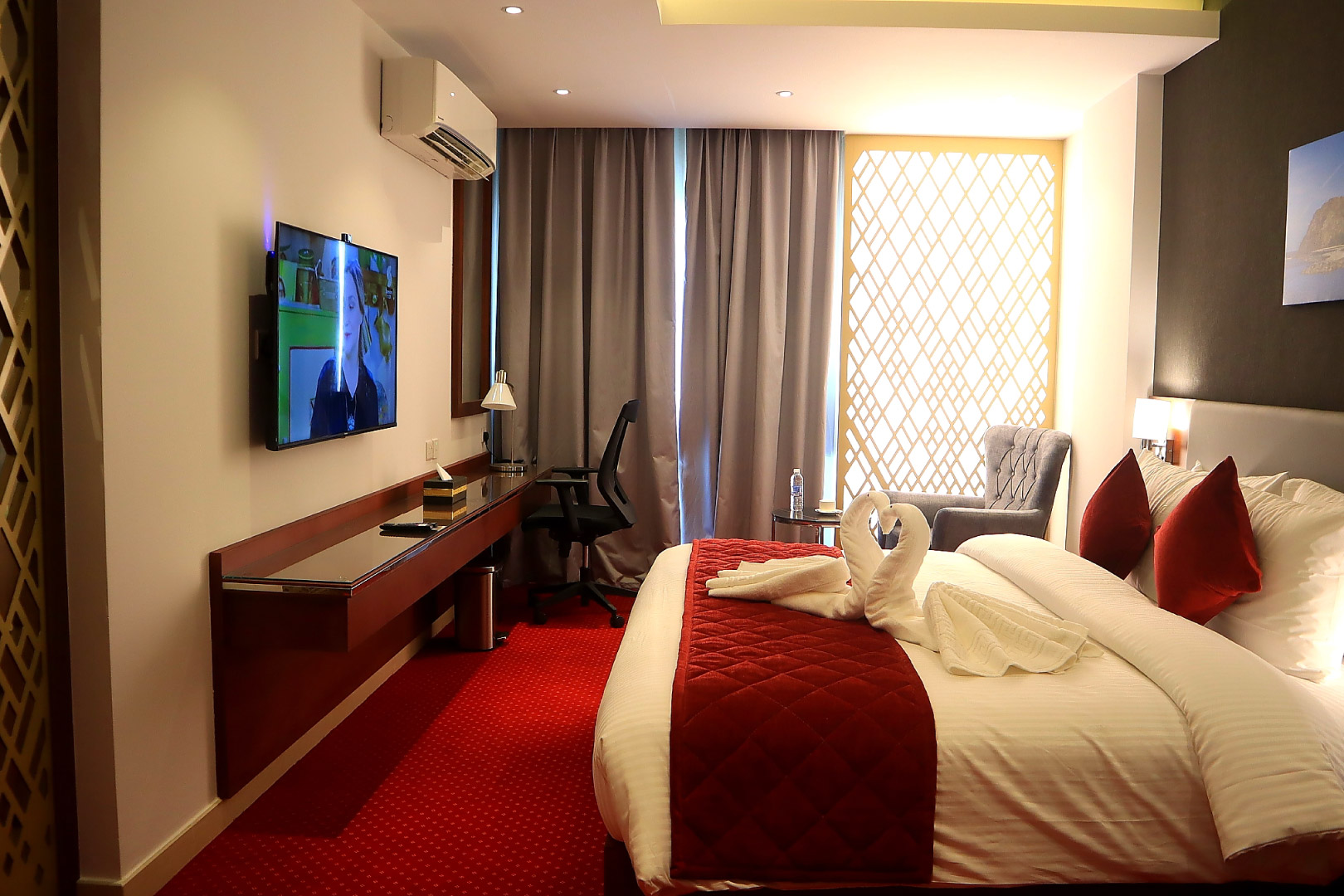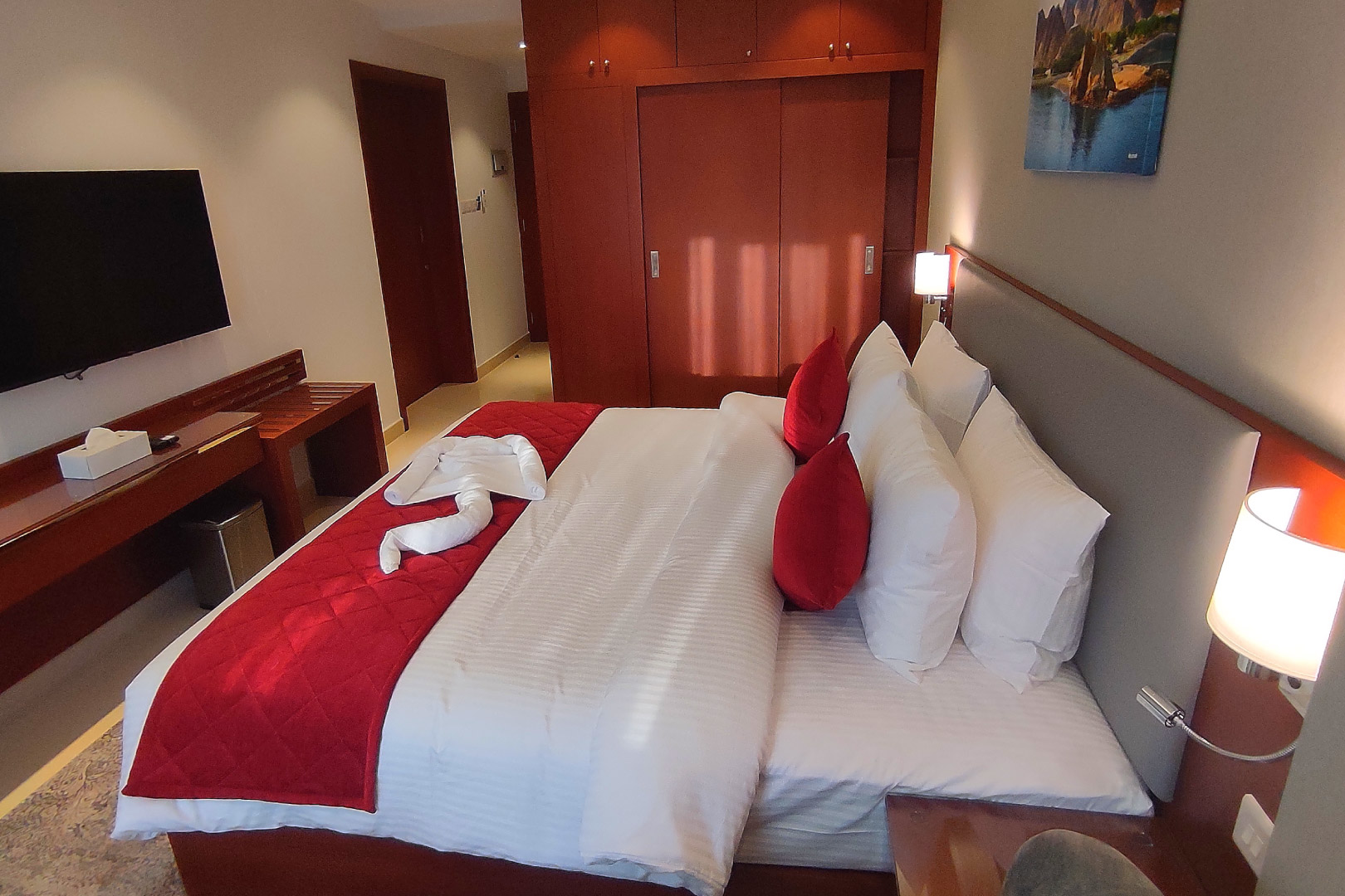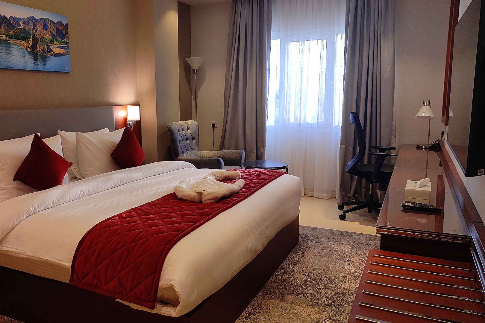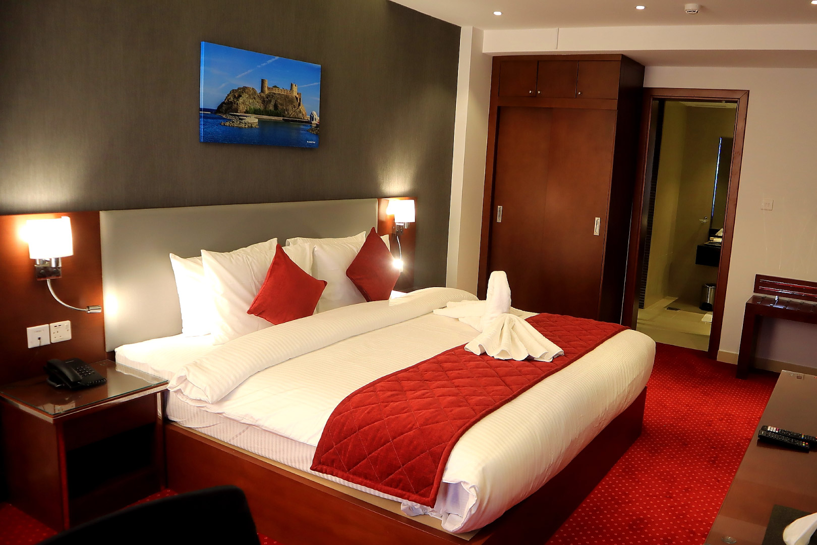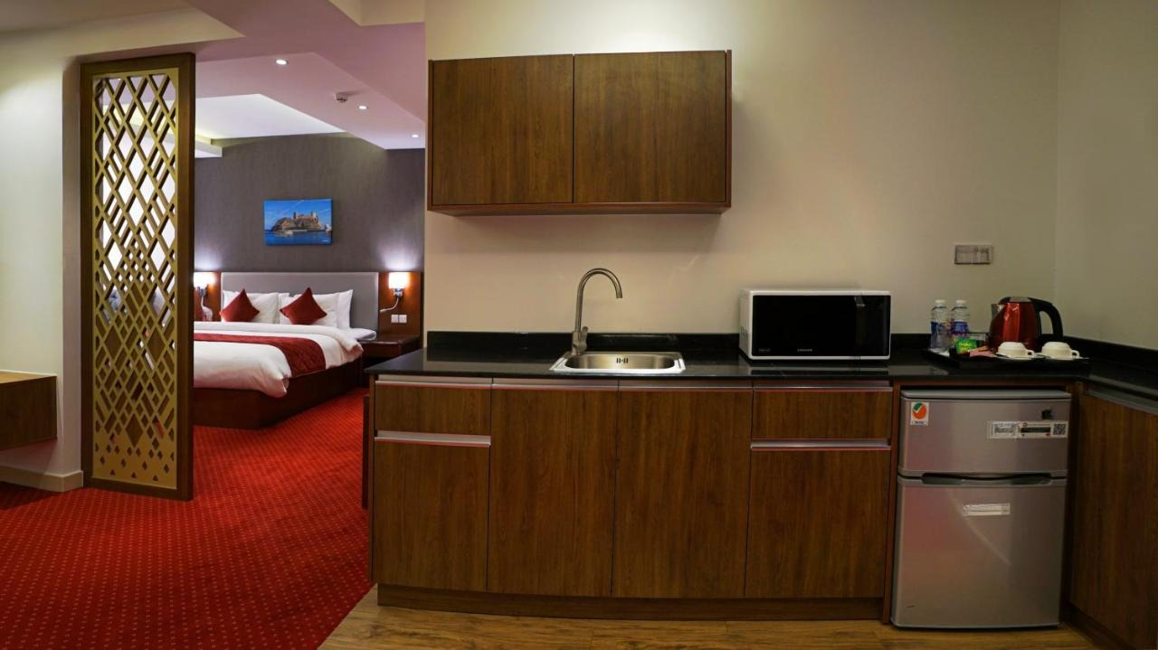 Однокомнатный номер укомплектован одной двуспальной кроватью, телевизором, кондиционером, чайным набором, беспроводным интернетом, телефоном, мини-баром. Ванная комната с душем/ванной, туалетными принадлежностями. По запросу предоставляется фен и гладильные принадлежности.