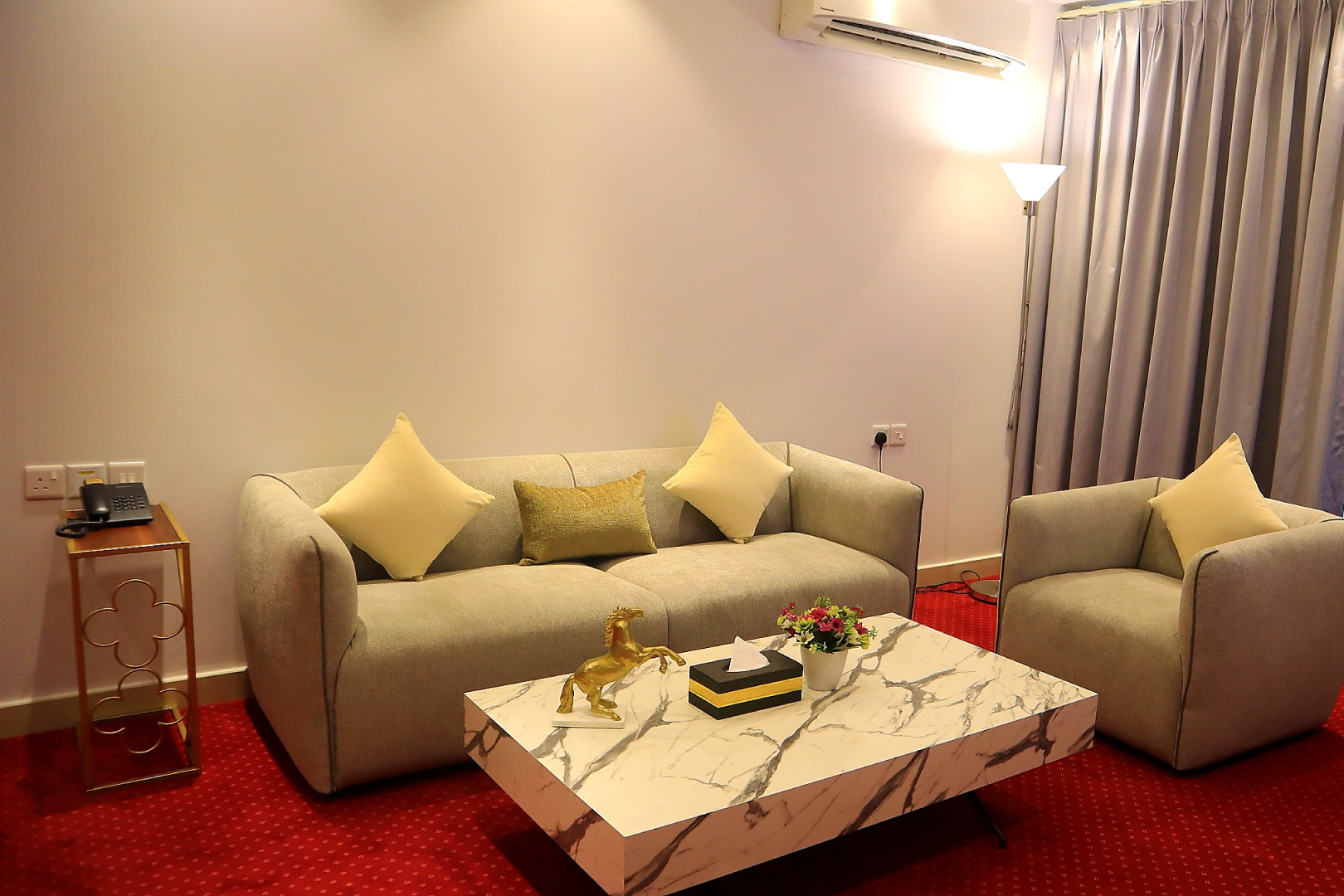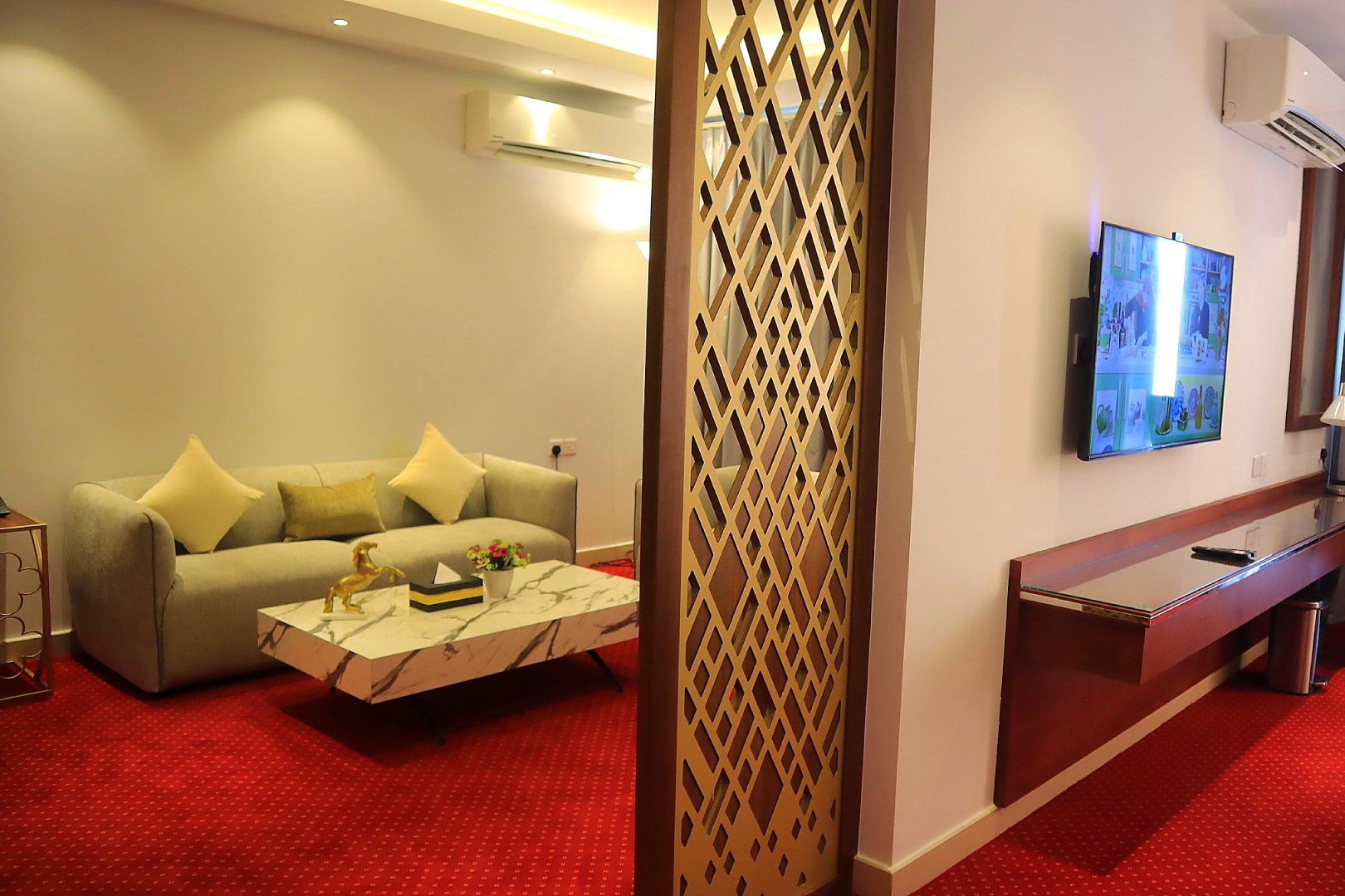 Просторный люкс состоит из спальни с двуспальной кроватью, гостиной с комплектом мягкой мебели, мини-кухни и ванной комнаты с душем/ванной. В комплектации телевизор, кондиционер, телефон, беспроводной интернет, электрический чайник, холодильник, микроволновая печь. По запросу предоставляются гладильные принадлежности и фен.