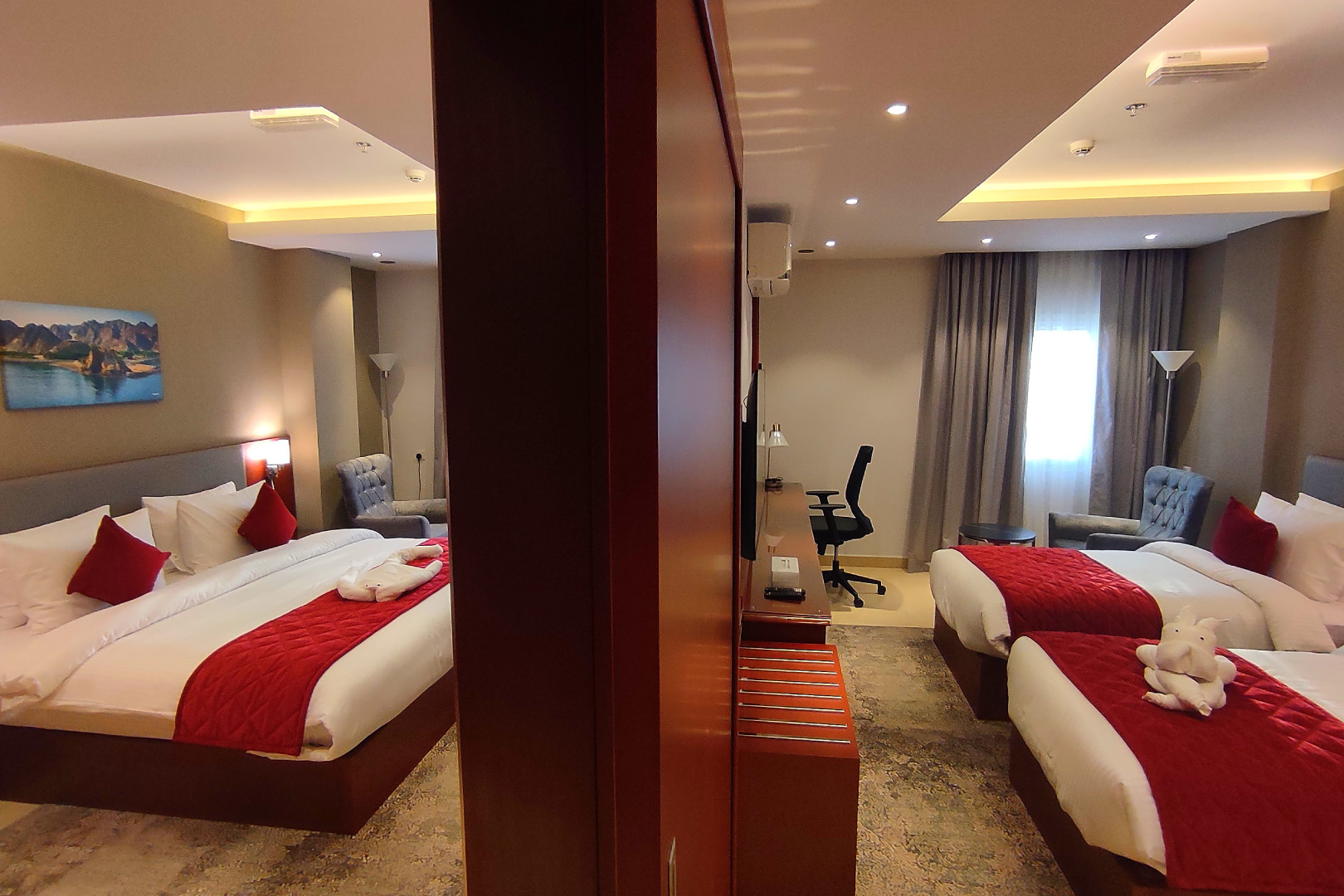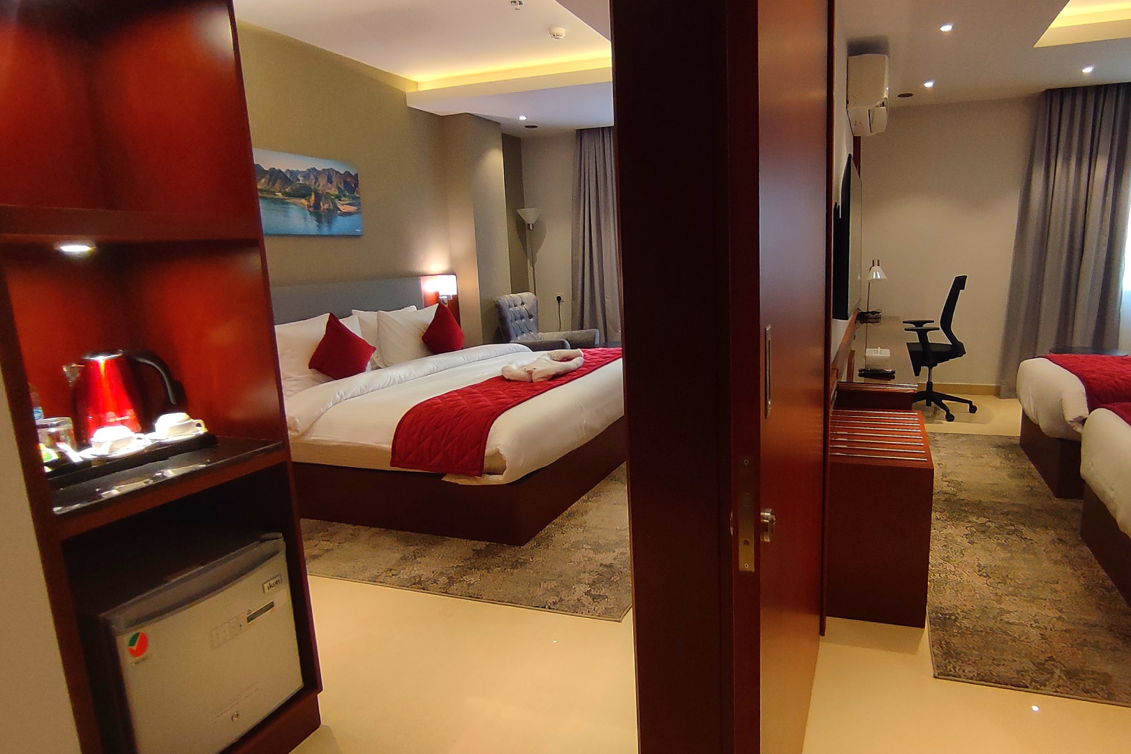 Двухкомнатный номер включает в себя две спальни с одной двуспальной и 2-мя односпальными кроватями, 2 ванные комнаты с душем/ванной. Из удобств телевизор, кондиционер, принадлежности для чая/кофе, Wi-Fi, телефон, мини-холодильник, фен и утюг предоставляются по запросу.