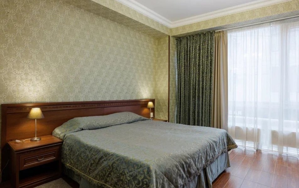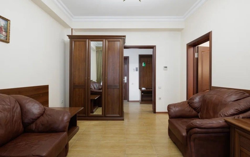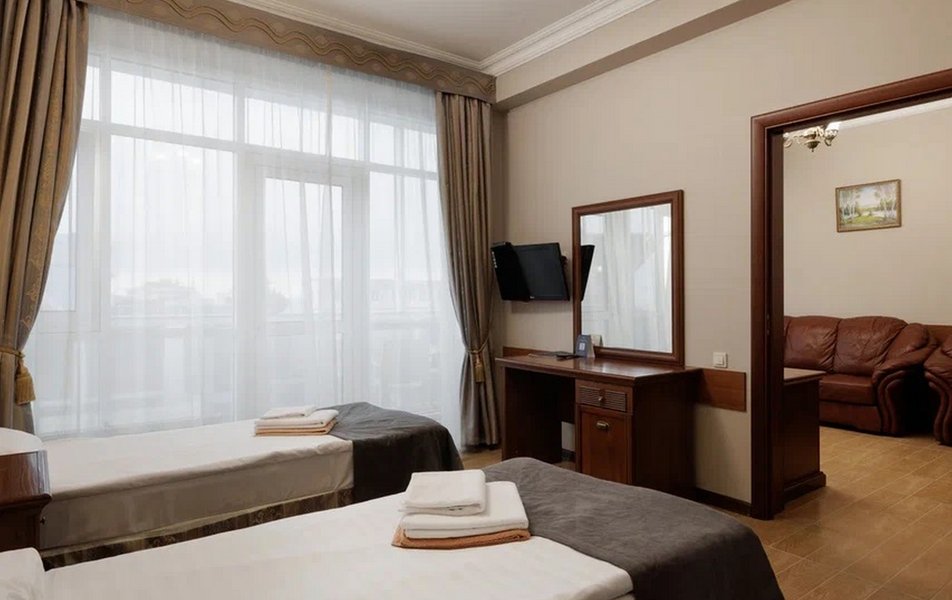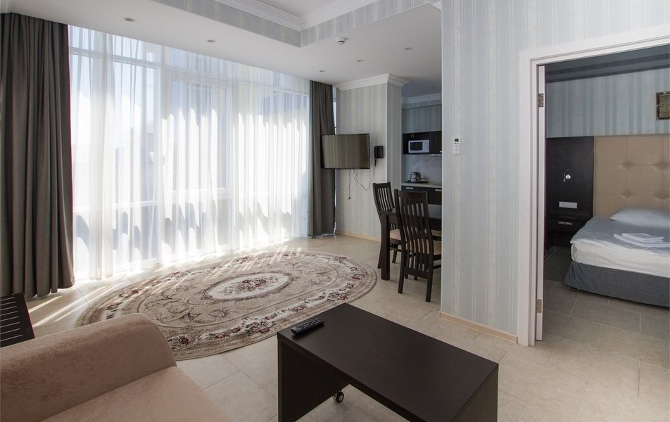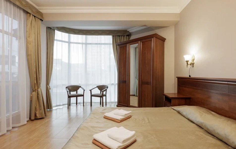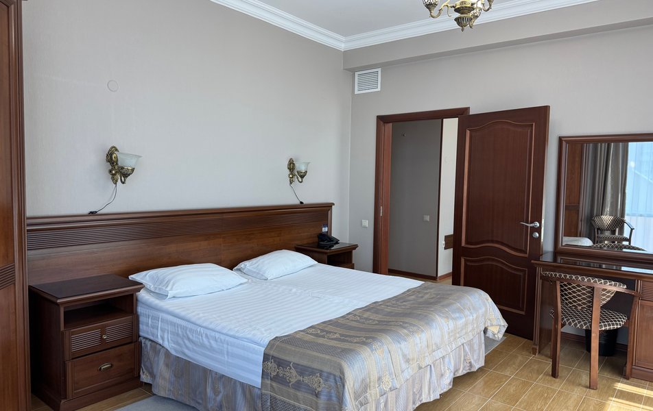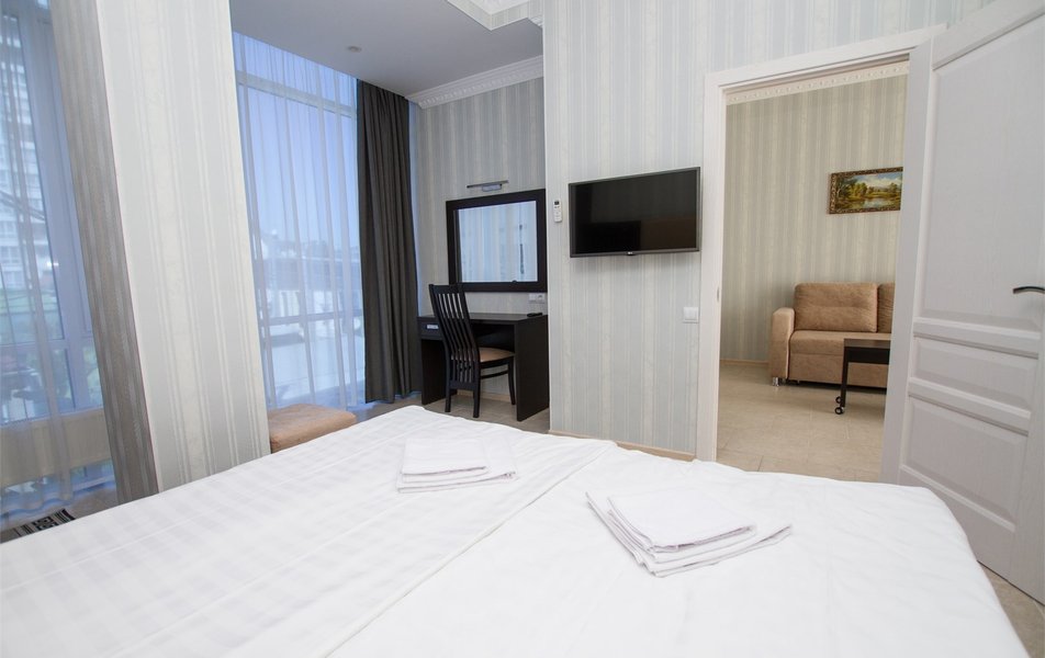 Делюкс 2-местный с кухней (корпус Атлант) Количество комнат: 2-комнатный Тип номера: Делюкс Дополнительное место: диван-кровать Кол-во доп. мест: 2 Кол-во номеров: 2 Кол-во основных мест: 2 Корпус: Атлант Мебель: зеркало, кровать двуспальная, прикроватные тумбочки, стол, стулья, шкаф Оборудование: кондиционер, телевизор ЖК, телефон, холодильник Санузел: с душевой кабиной, тапочки, фен, халат Сервис: Wi-Fi бесплатно, room-сервис: 24 часа, смена полотенец: ежедневно, смена постельного белья: 1 раз в 4 дня, уборка номера: ежедневно, услуги внутренней телефонной связи