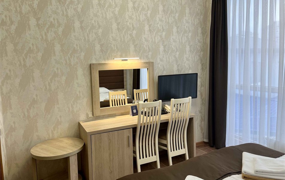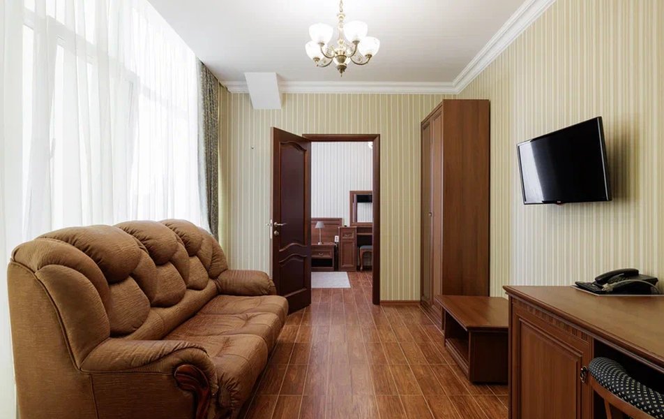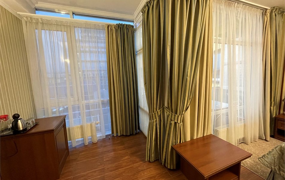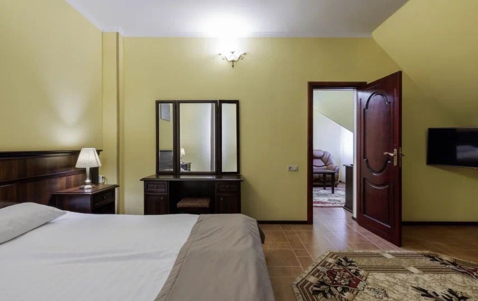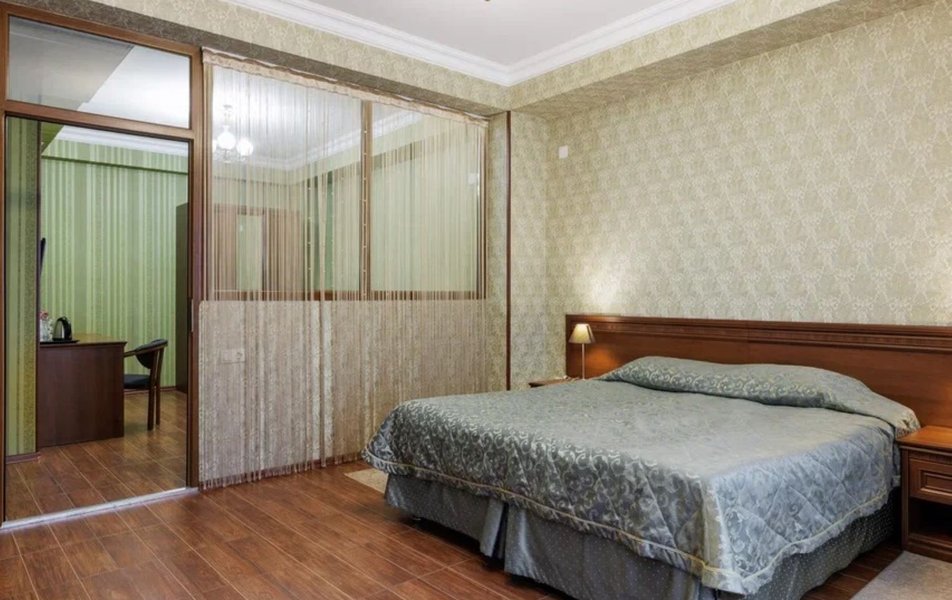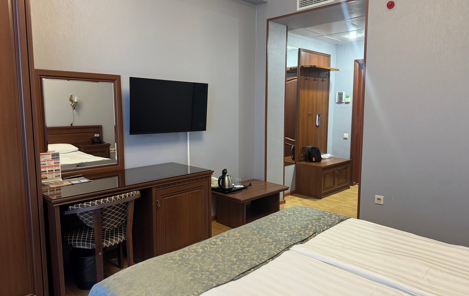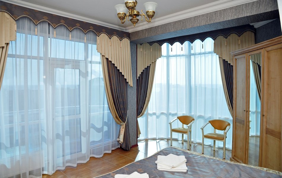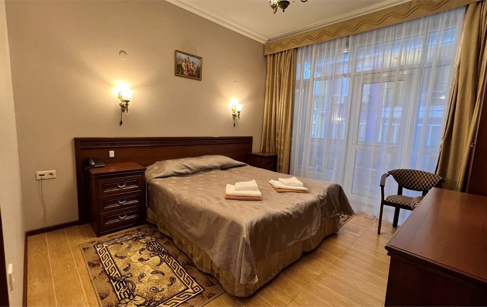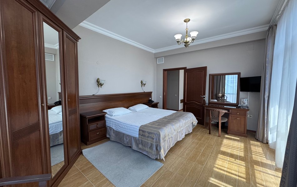 Делюкс 2-местный с балконом (корпус Люкс) Количество комнат: 2-комнатный Тип номера: Делюкс Дополнительное место: диван Вид из номера: на двор: на город Кол-во основных мест: 2 Корпус: Люкс Площадь (кв. м): 40 Балкон: с мебелью Мебель: диван, кровать двуспальная, набор мягкой мебели, прикроватные тумбочки, столик журнальный, столик туалетный, стул, шкаф Оборудование: кондиционер, мини-холодильник, сейф, телевизор, телефон, чайная станция, чайный набор посуды Санузел: с душем, тапочки, туалетные принадлежности, фен, халат Сервис: Wi-Fi бесплатно, room-сервис: 24 часа, смена полотенец: ежедневно, смена постельного белья: 1 раз в 4 дня, уборка номера: ежедневно, услуги внутренней телефонной связи