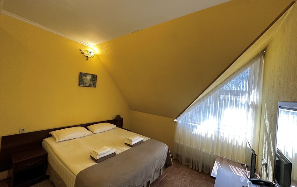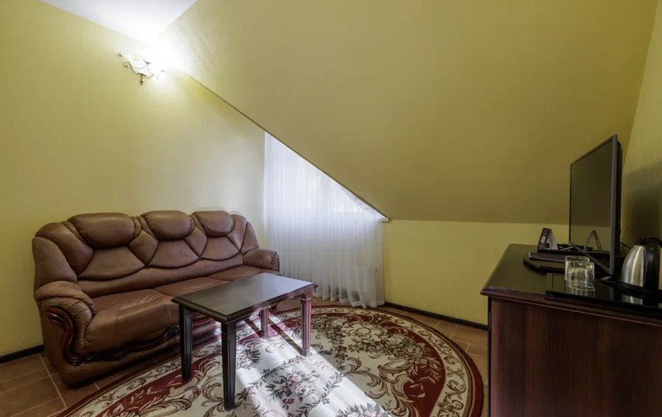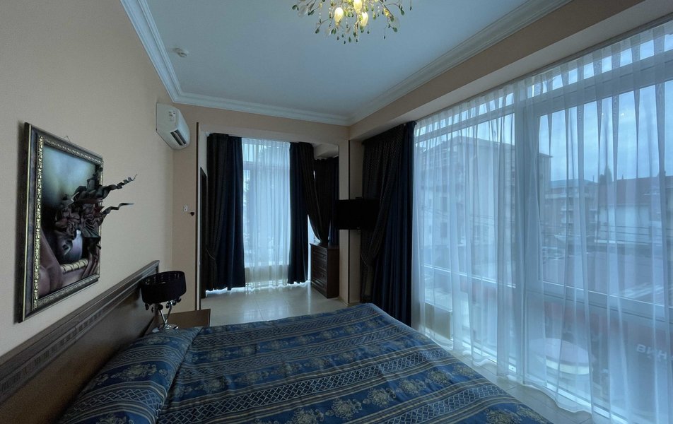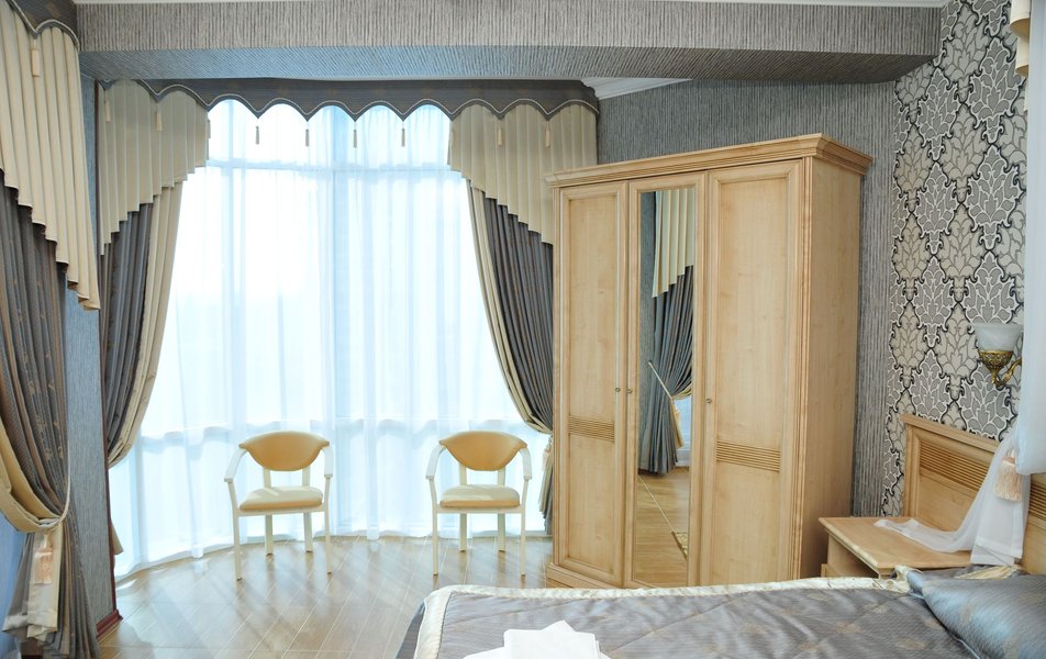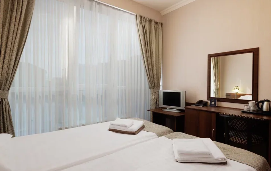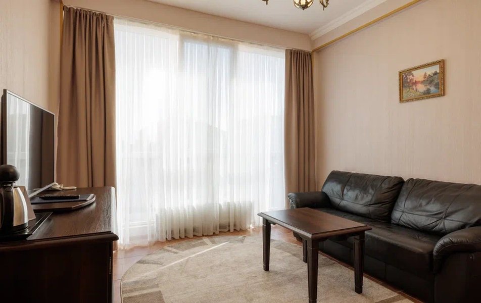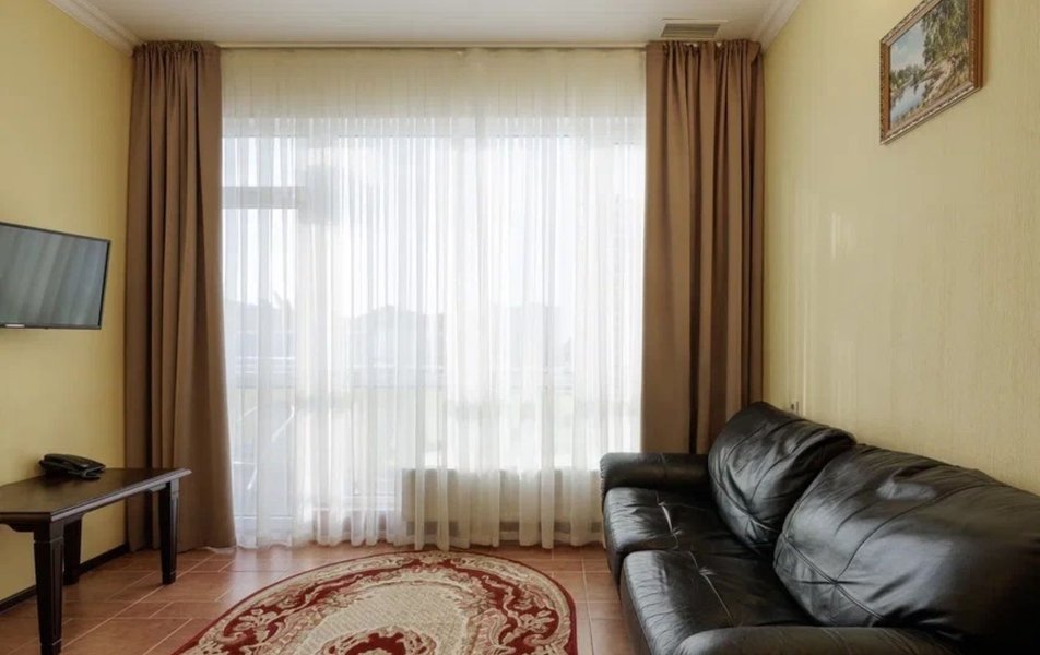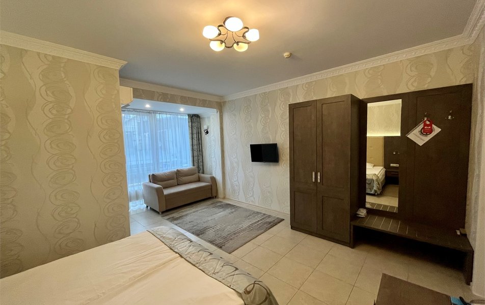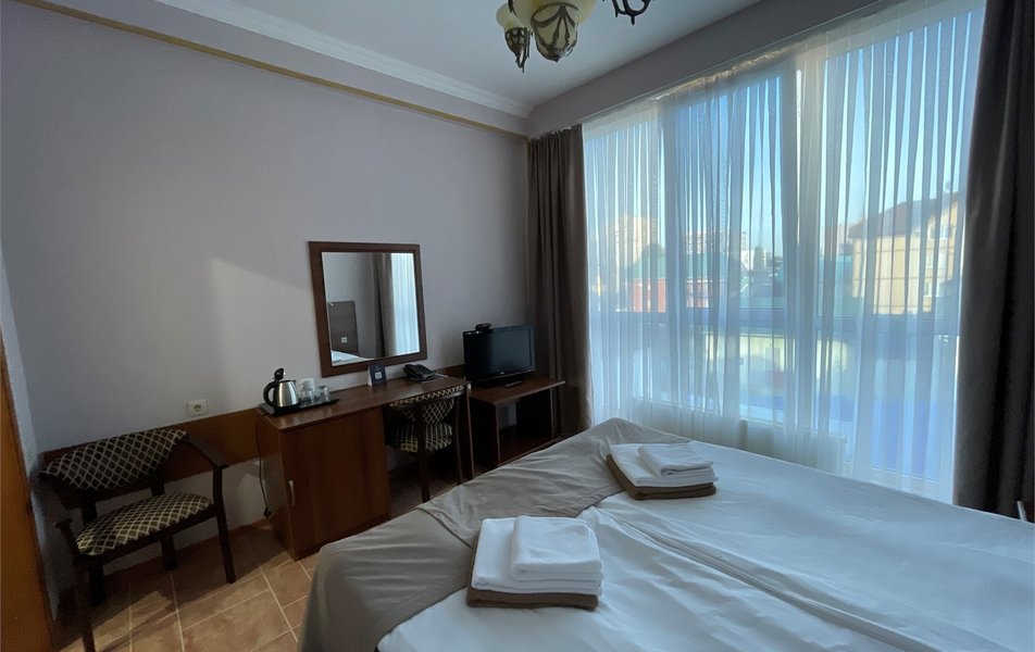 Делюкс 2-местный с балконом (корпус Люкс) Количество комнат: 2-комнатный Тип номера: Делюкс Дополнительное место: диван Вид из номера: на двор: на город Кол-во основных мест: 2 Корпус: Люкс Площадь (кв. м): 40 Балкон: с мебелью Мебель: диван, кровать двуспальная, набор мягкой мебели, прикроватные тумбочки, столик журнальный, столик туалетный, стул, шкаф Оборудование: кондиционер, мини-холодильник, сейф, телевизор, телефон, чайная станция, чайный набор посуды Санузел: с душем, тапочки, туалетные принадлежности, фен, халат Сервис: Wi-Fi бесплатно, room-сервис: 24 часа, смена полотенец: ежедневно, смена постельного белья: 1 раз в 4 дня, уборка номера: ежедневно, услуги внутренней телефонной связи