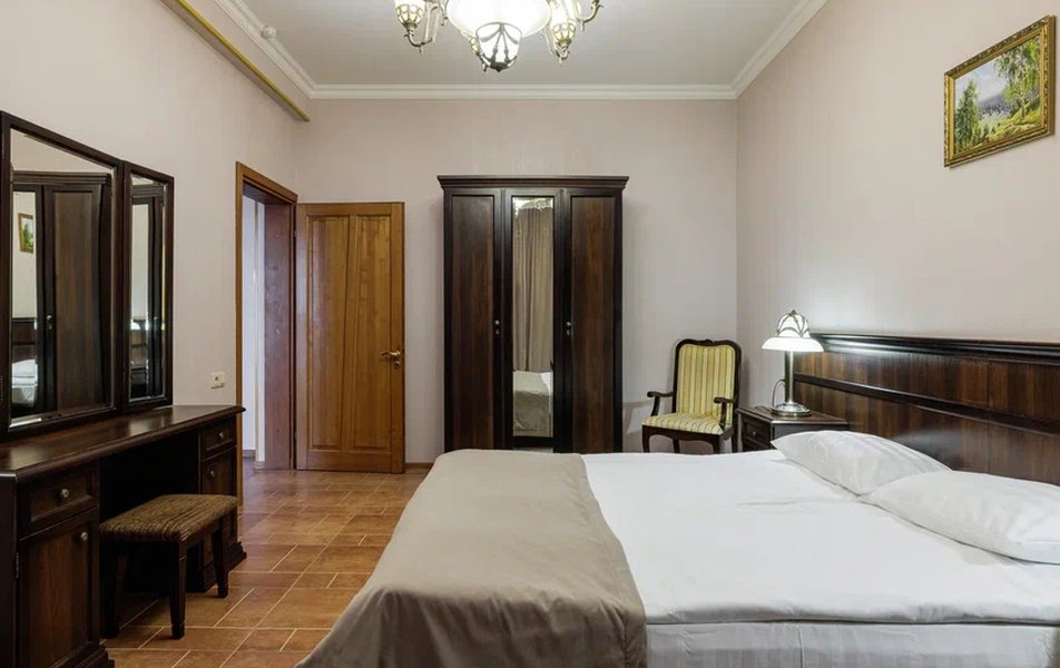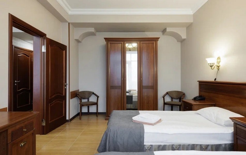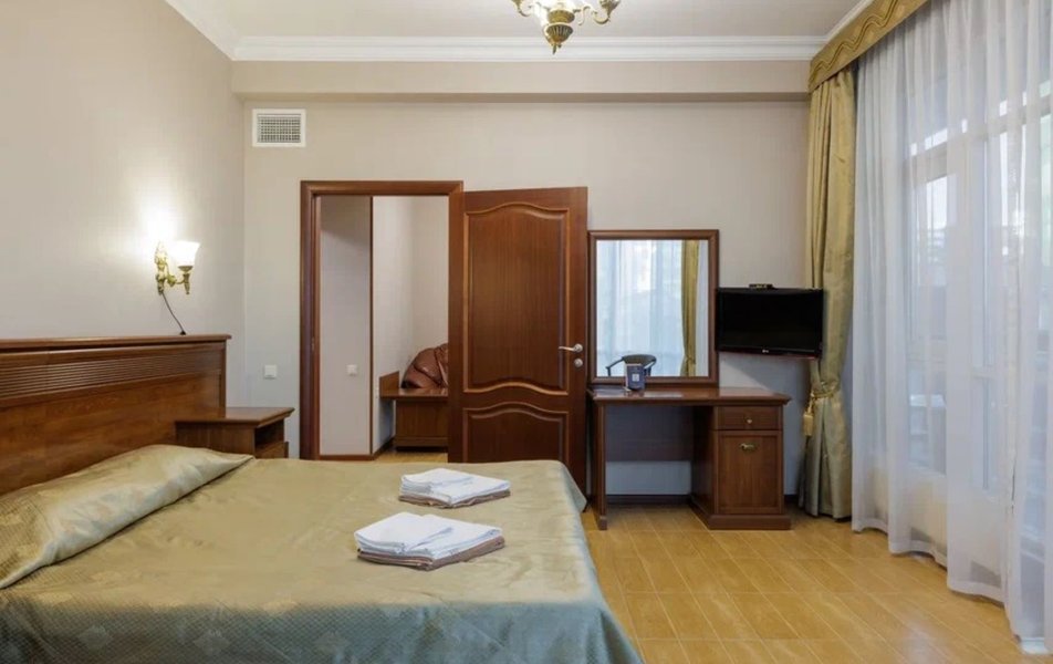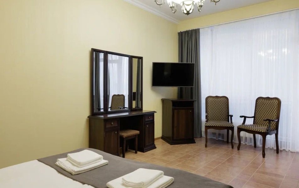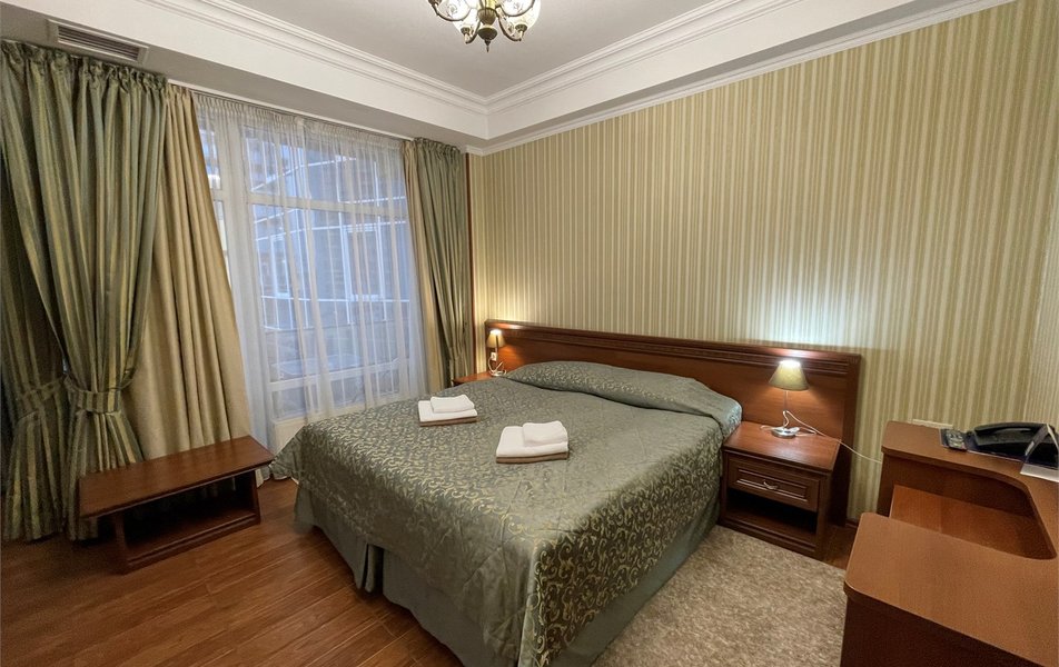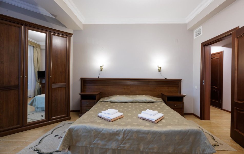 Делюкс 2-местный с кухней (корпус Люкс) Количество комнат: 2-комнатный Тип номера: Делюкс Дополнительное место: диван-кровать Вид из номера: на двор Кол-во доп. мест: 2 Кол-во основных мест: 2 Корпус: Люкс Площадь (кв. м): 50 Мебель: вешалка, диван, зеркало, комод, кресло, кровать двуспальная, прикроватные тумбочки, стол, стулья, шкаф Оборудование: гладильная доска, кондиционер, микроволновая печь, набор посуды, плита электрическая, стиральная машина, сушилка для белья, телевизор, телефон, теплый пол, утюг, холодильник, чайная станция, чайный набор посуды Санузел: с душевой кабиной, тапочки, туалетные принадлежности, фен, халат Сервис: Wi-Fi бесплатно, room-сервис: 24 часа, смена полотенец: ежедневно, смена постельного белья: 1 раз в 4 дня, уборка номера: ежедневно, услуги внутренней телефонной связи