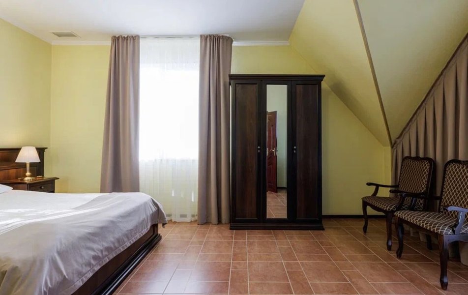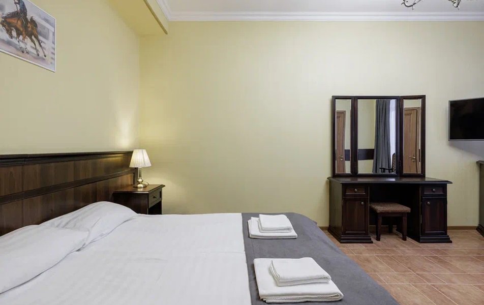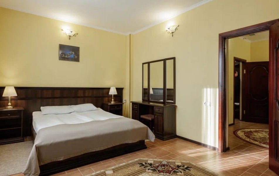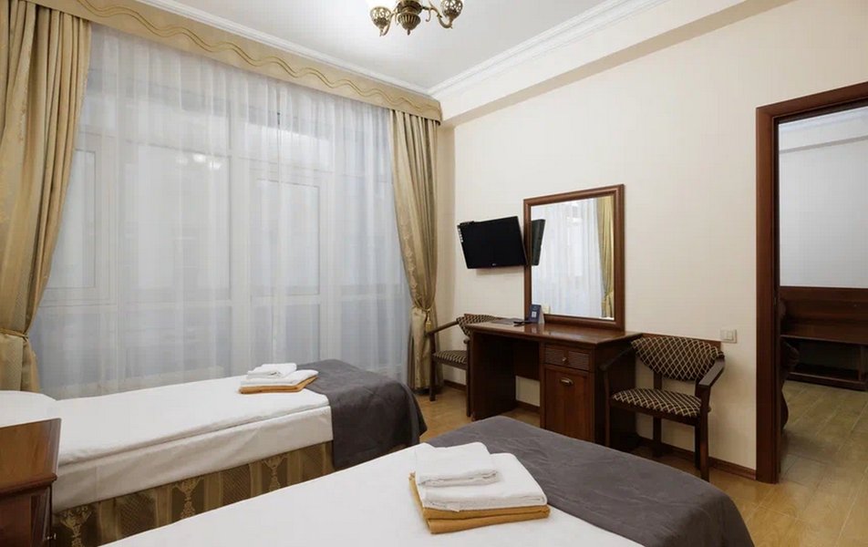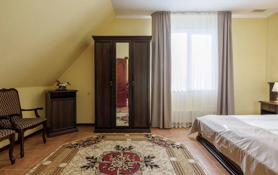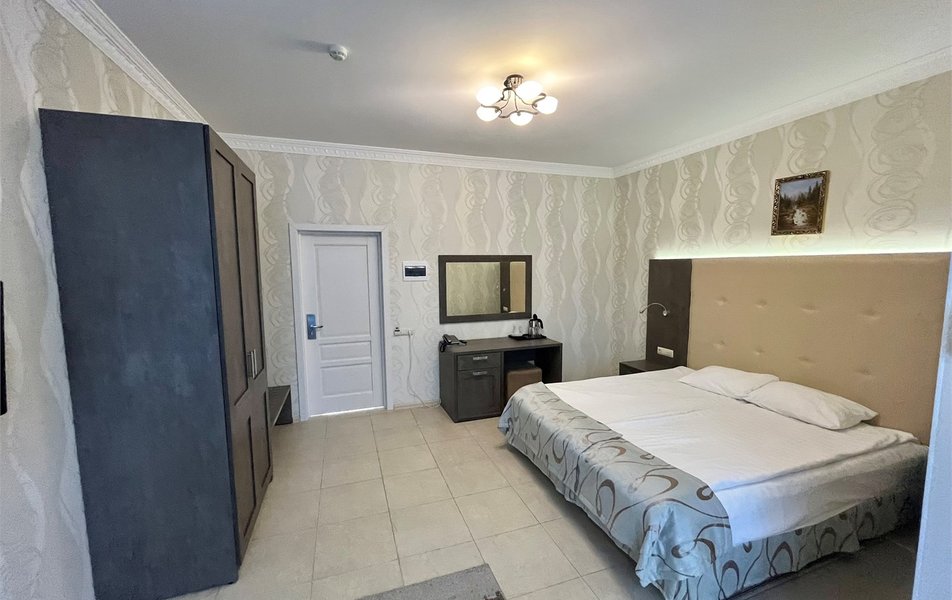Делюкс 2-местный с кухней (корпус Люкс) Количество комнат: 2-комнатный Тип номера: Делюкс Дополнительное место: диван-кровать Вид из номера: на двор Кол-во доп. мест: 2 Кол-во основных мест: 2 Корпус: Люкс Площадь (кв. м): 50 Мебель: вешалка, диван, зеркало, комод, кресло, кровать двуспальная, прикроватные тумбочки, стол, стулья, шкаф Оборудование: гладильная доска, кондиционер, микроволновая печь, набор посуды, плита электрическая, стиральная машина, сушилка для белья, телевизор, телефон, теплый пол, утюг, холодильник, чайная станция, чайный набор посуды Санузел: с душевой кабиной, тапочки, туалетные принадлежности, фен, халат Сервис: Wi-Fi бесплатно, room-сервис: 24 часа, смена полотенец: ежедневно, смена постельного белья: 1 раз в 4 дня, уборка номера: ежедневно, услуги внутренней телефонной связи