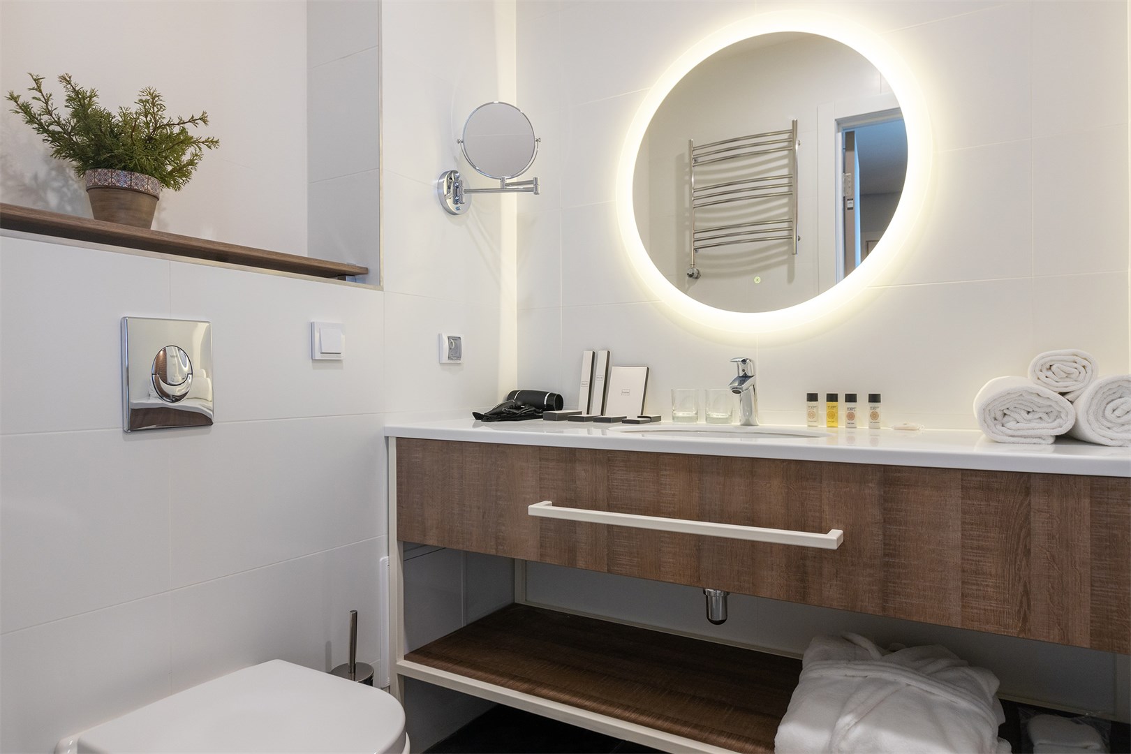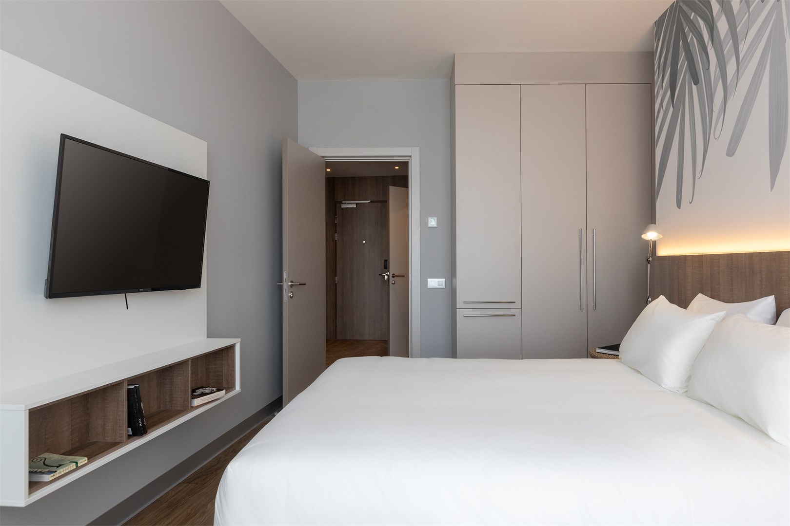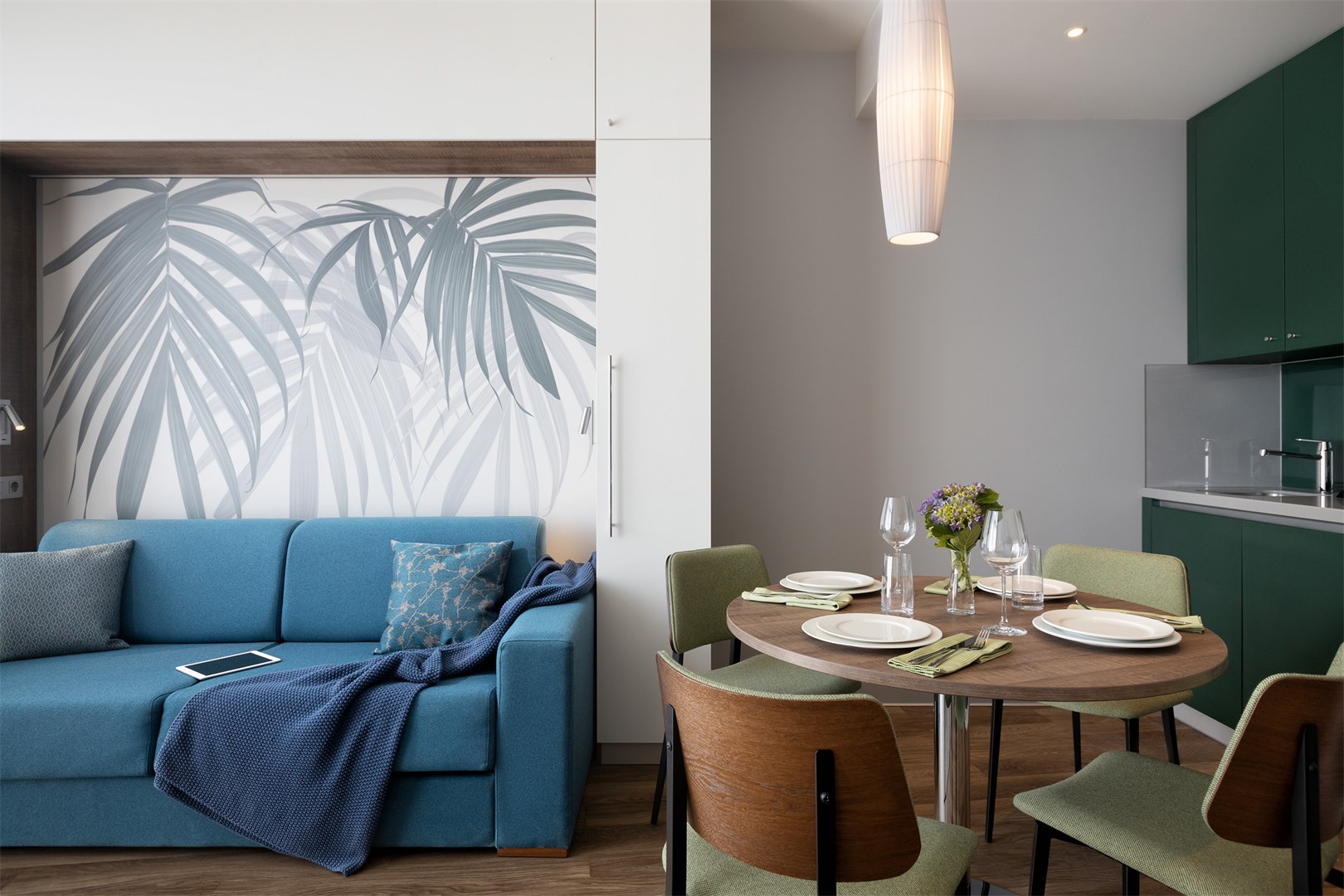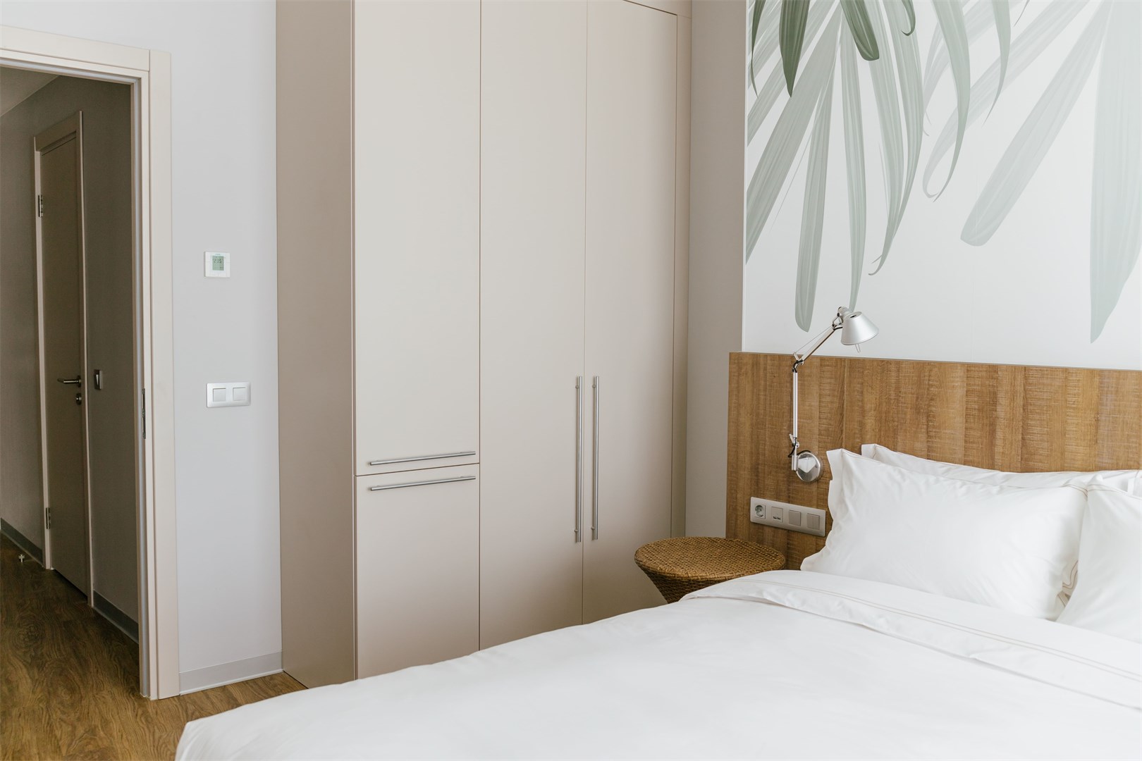 Однокомнатный номер с двуспальной кроватью, французским балконом, кухонным уголком и обеденной зоной. В оснащение входит телевизор, телефон, умная колонка Алиса, система климат-контроля, чайный набор, шкаф-купе. Кухня оборудована варочной поверхностью, холодильником, посудомоечной машиной, микроволновкой, набором посуды.