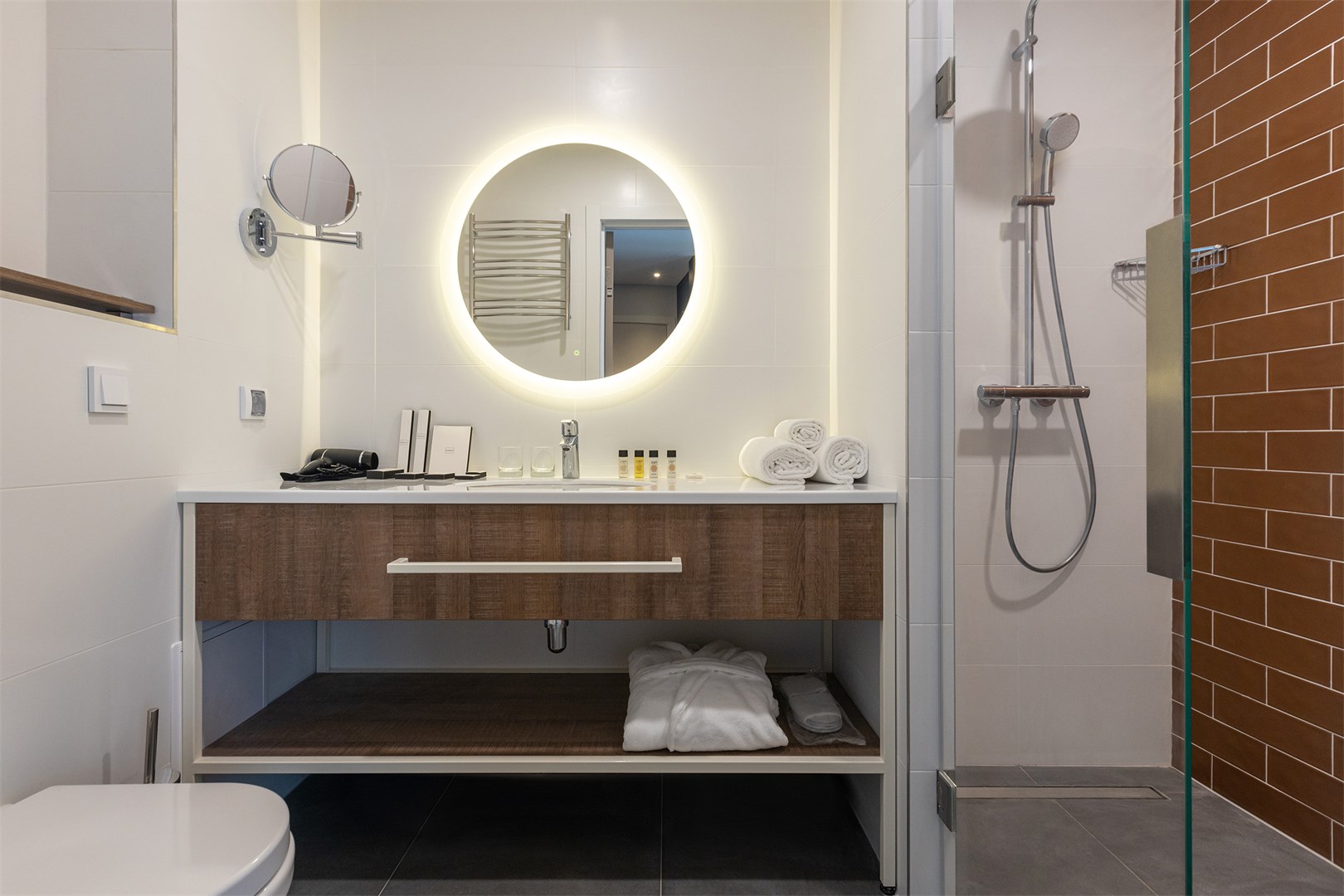 В номере есть диван-кровать, балкон, кухонный уголок, обеденная зона, ванная комната с душем. В удобства включены спутниковое телевидение, телефон, умная колонка Алиса, система климат-контроля, чайный набор, шкаф-купе. Кухня оборудована варочной поверхностью, холодильником, посудомоечной машиной, микроволновкой, набором посуды.